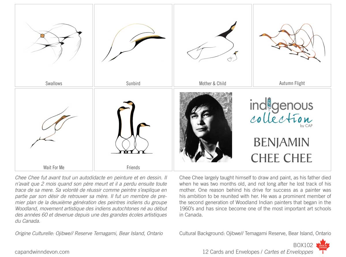 Il fut un membre de premier plan de la 2ème génération des peintres indiens du groupe Woodland, mouvement artistique des Indiens autochtones né au début des années 60 et devenue depuis une des grandes écoles artistiques du Canada. A la différence de nombre de ses contemporains, Chee Chee subit l’influence de l’art abstrait moderne. Alors que la pluspart des jeunes artistes du mouvement Woodland se contentent d’imiter le style du fondateur Norval Morrisseau et d’illustrer leurs mythes et leurs légendes au moyen d’une écriture directe et “primitive”, Chee Chee adopte un style graphique plus dépouillé, réduisant la ligne et l’image selon la tendance principale de l’art moderne dans le monde.