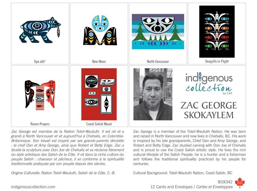 Zac George est membre de la Nation Tsleil-Waututh. Il est né et a grandi à North Vancouver et vit aujourd’hui à Chehalis, en Colombie-Britannique. Son travail est inspiré par ses grands-parents décédés : le chef Dan et Amy George, ainsi que Robert et Betty Edge. Zac a étudié la sculpture avec Don Joe de Chehalis et se réclame fièrement du style artistique des Salish de la Côte. Il vit dans la riche culture du peuple Salish : chasseur et pêcheur, il se conforme à la spiritualité traditionnelle pratiquée par son peuple depuis des siècles.