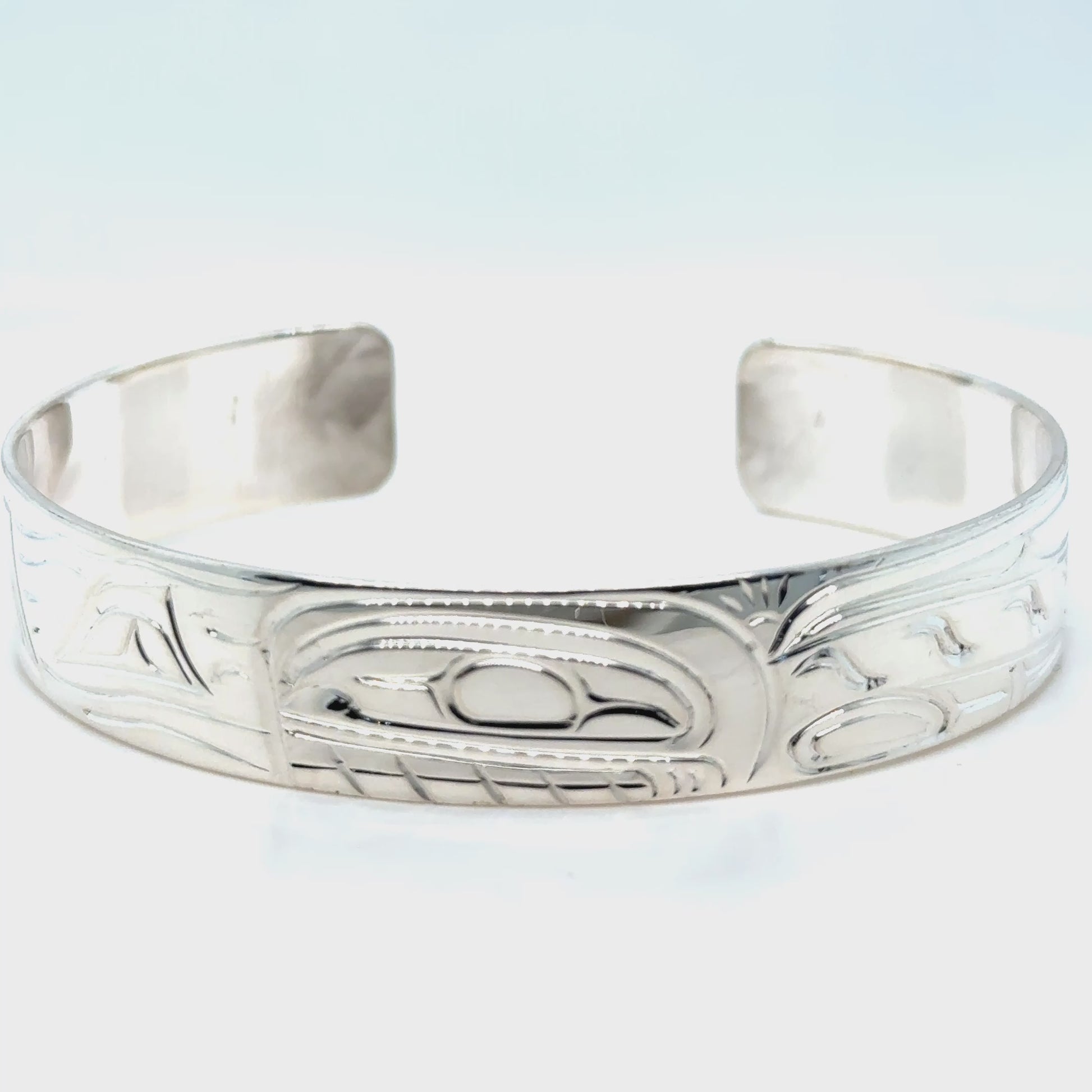 Mike Matilpi, born in Alert Bay to the Kwakwaka’wakw Nation and a family of revered wood and jewellery carvers, has been carving silver and gold jewellery since 1993. He was taught by his father, Charles Harper, himself a well-known carver who has been working since 1974. Mike has also been greatly influenced by other relatives of his, such as Doug Harper, Glen Harper, Les Harper, George Matilpi, Dennis Matilpi, and Paddy Seaweed. He has taken many specialized courses in silversmithing to further his craft, including bezel stone setting. His work can be recognized by the masterful combination of gold and silver and the charming and traditional animal designs.