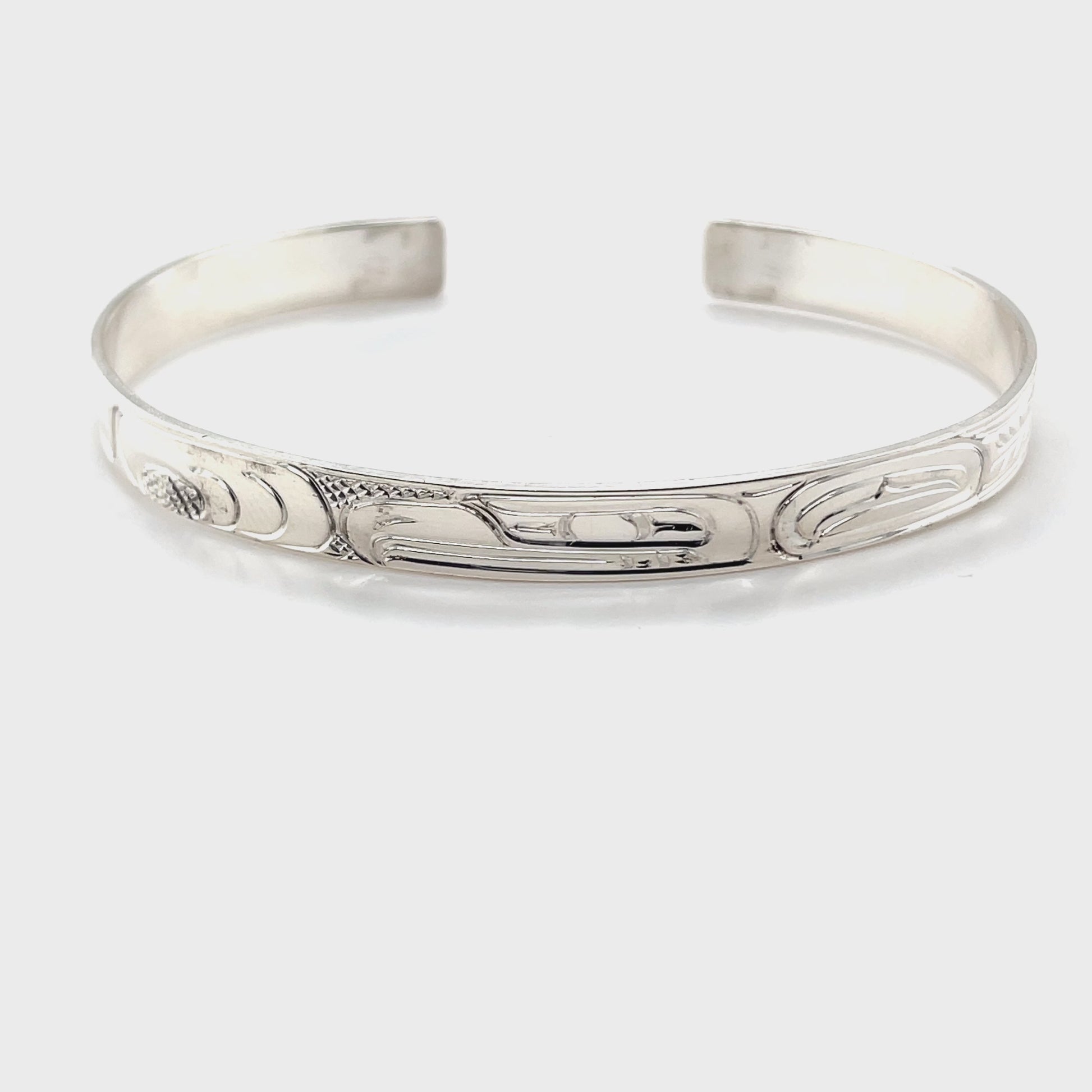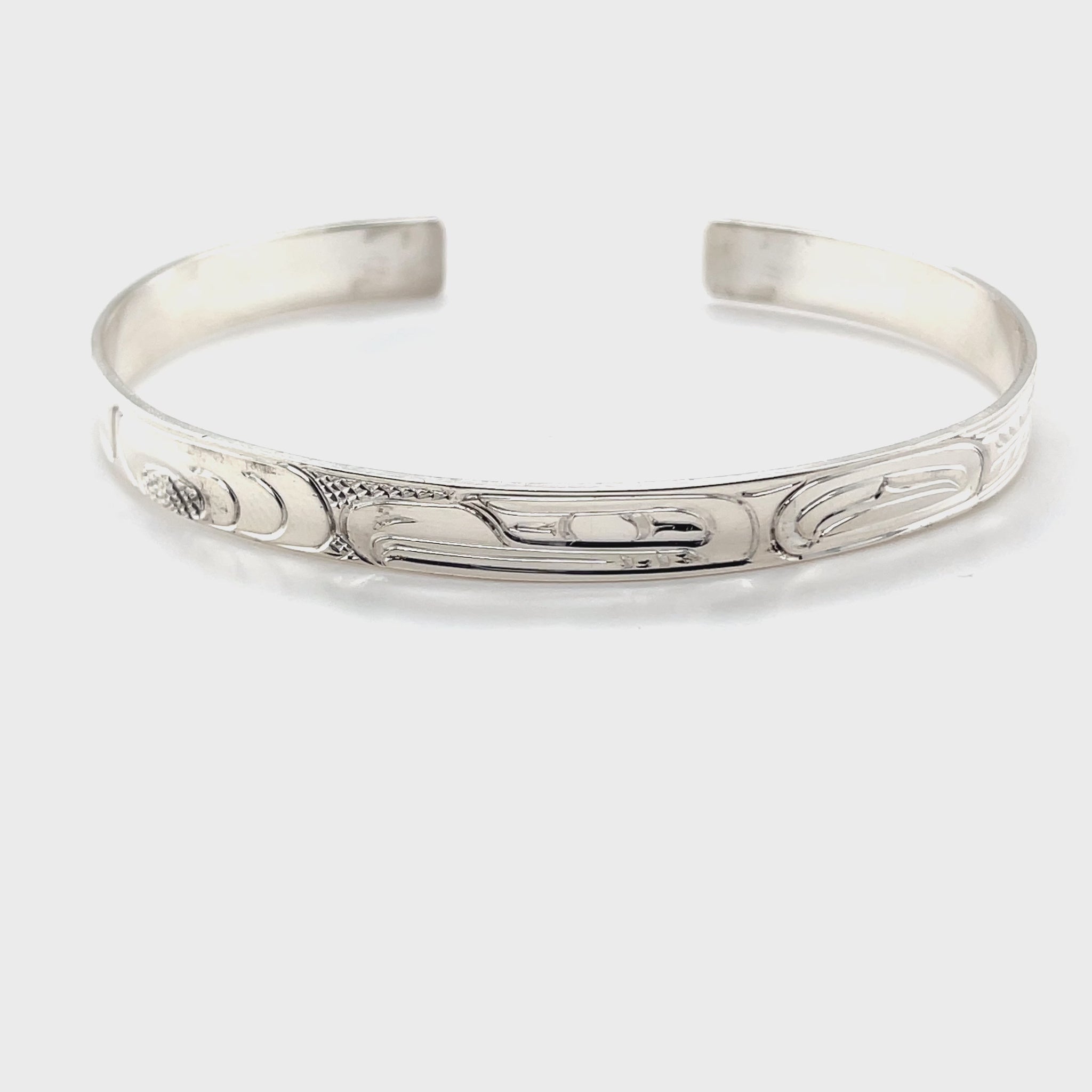 Mike Matilpi, born in Alert Bay to the Kwakwaka’wakw Nation and a family of revered wood and jewellery carvers, has been carving silver and gold jewellery since 1993. He was taught by his father, Charles Harper, himself a well-known carver who has been working since 1974. Mike has also been greatly influenced by other relatives of his, such as Doug Harper, Glen Harper, Les Harper, George Matilpi, Dennis Matilpi, and Paddy Seaweed. He has taken many specialized courses in silversmithing to further his craft, including bezel stone setting. His work can be recognized by the masterful combination of gold and silver and the charming and traditional animal designs.