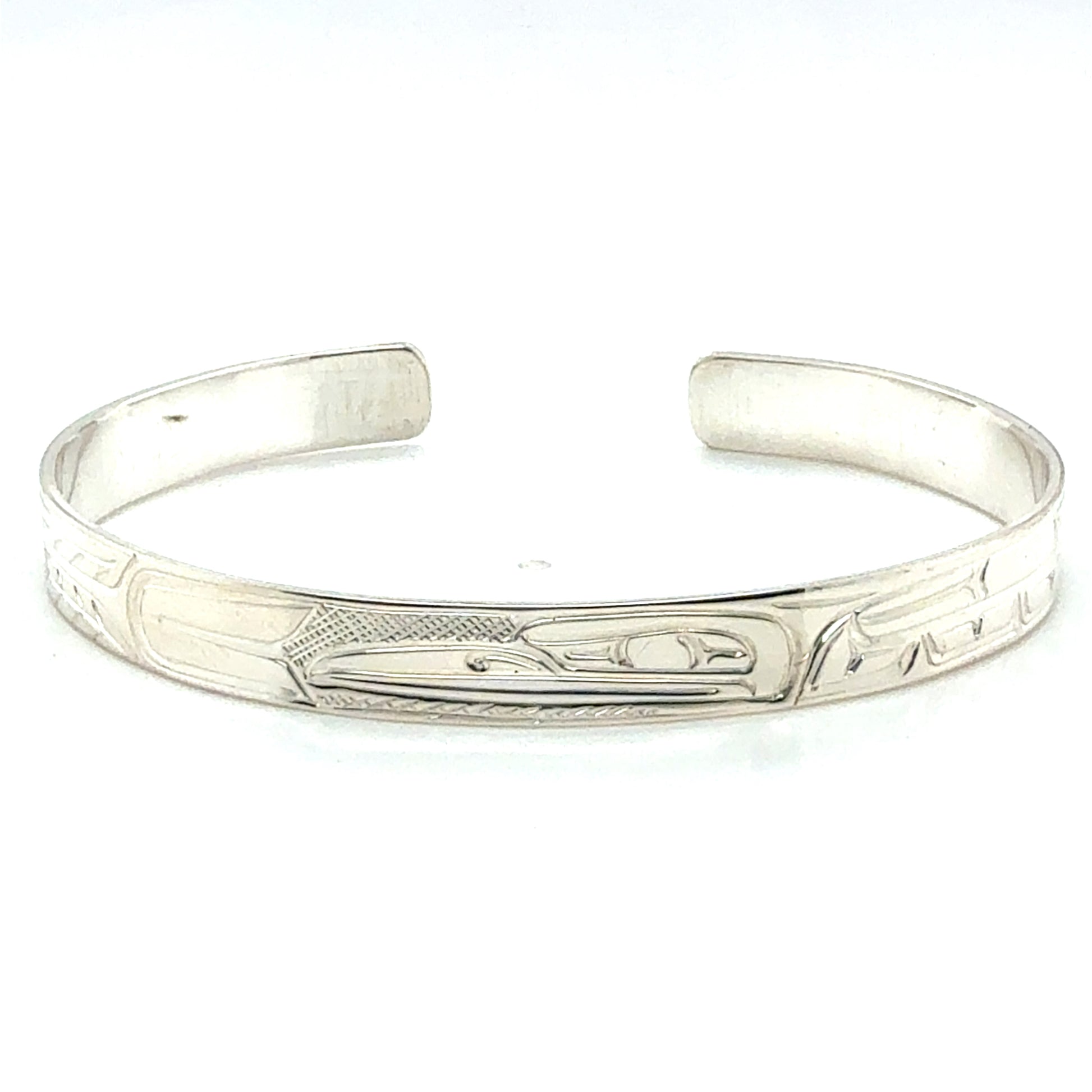 Mike Matilpi, born in Alert Bay to the Kwakwaka’wakw Nation and a family of revered wood and jewellery carvers, has been carving silver and gold jewellery since 1993. He was taught by his father, Charles Harper, himself a well-known carver who has been working since 1974. Mike has also been greatly influenced by other relatives of his, such as Doug Harper, Glen Harper, Les Harper, George Matilpi, Dennis Matilpi, and Paddy Seaweed. He has taken many specialized courses in silversmithing to further his craft, including bezel stone setting. His work can be recognized by the masterful combination of gold and silver and the charming and traditional animal designs.
