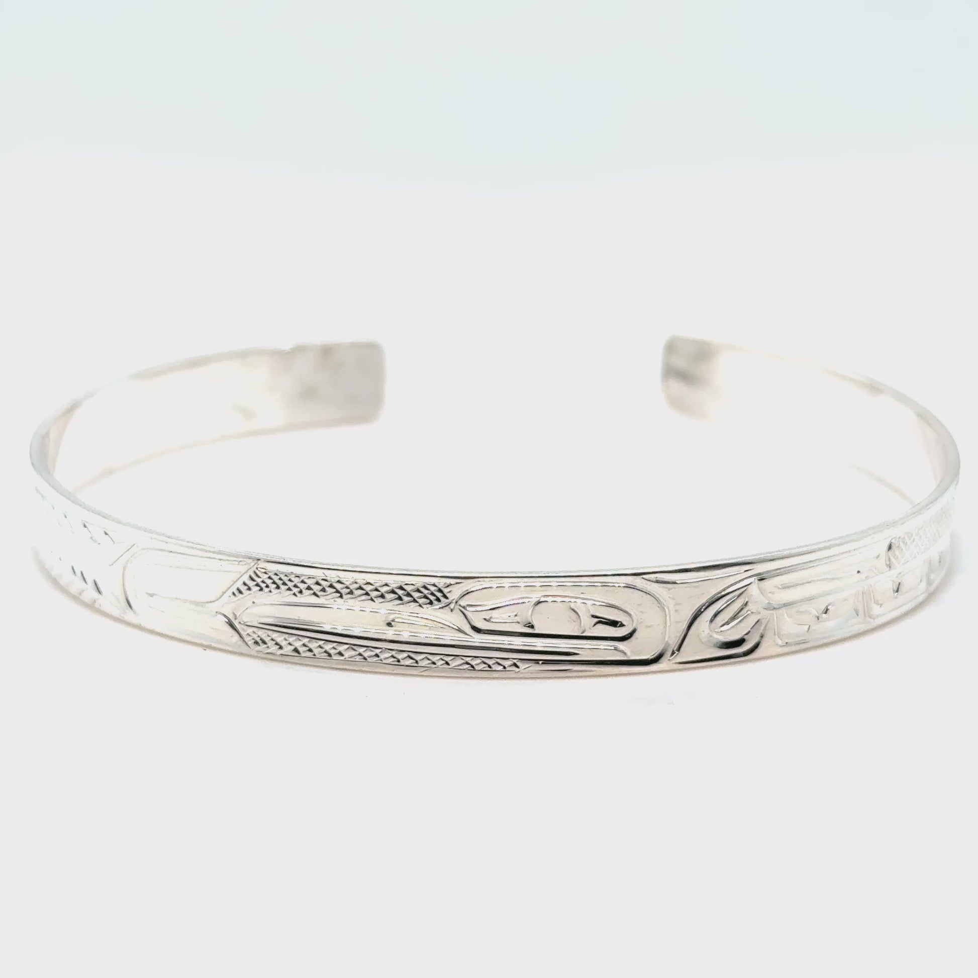 Mike Matilpi, born in Alert Bay to the Kwakwaka’wakw Nation and a family of revered wood and jewellery carvers, has been carving silver and gold jewellery since 1993. He was taught by his father, Charles Harper, himself a well-known carver who has been working since 1974. Mike has also been greatly influenced by other relatives of his, such as Doug Harper, Glen Harper, Les Harper, George Matilpi, Dennis Matilpi, and Paddy Seaweed. He has taken many specialized courses in silversmithing to further his craft, including bezel stone setting. His work can be recognized by the masterful combination of gold and silver and the charming and traditional animal designs.