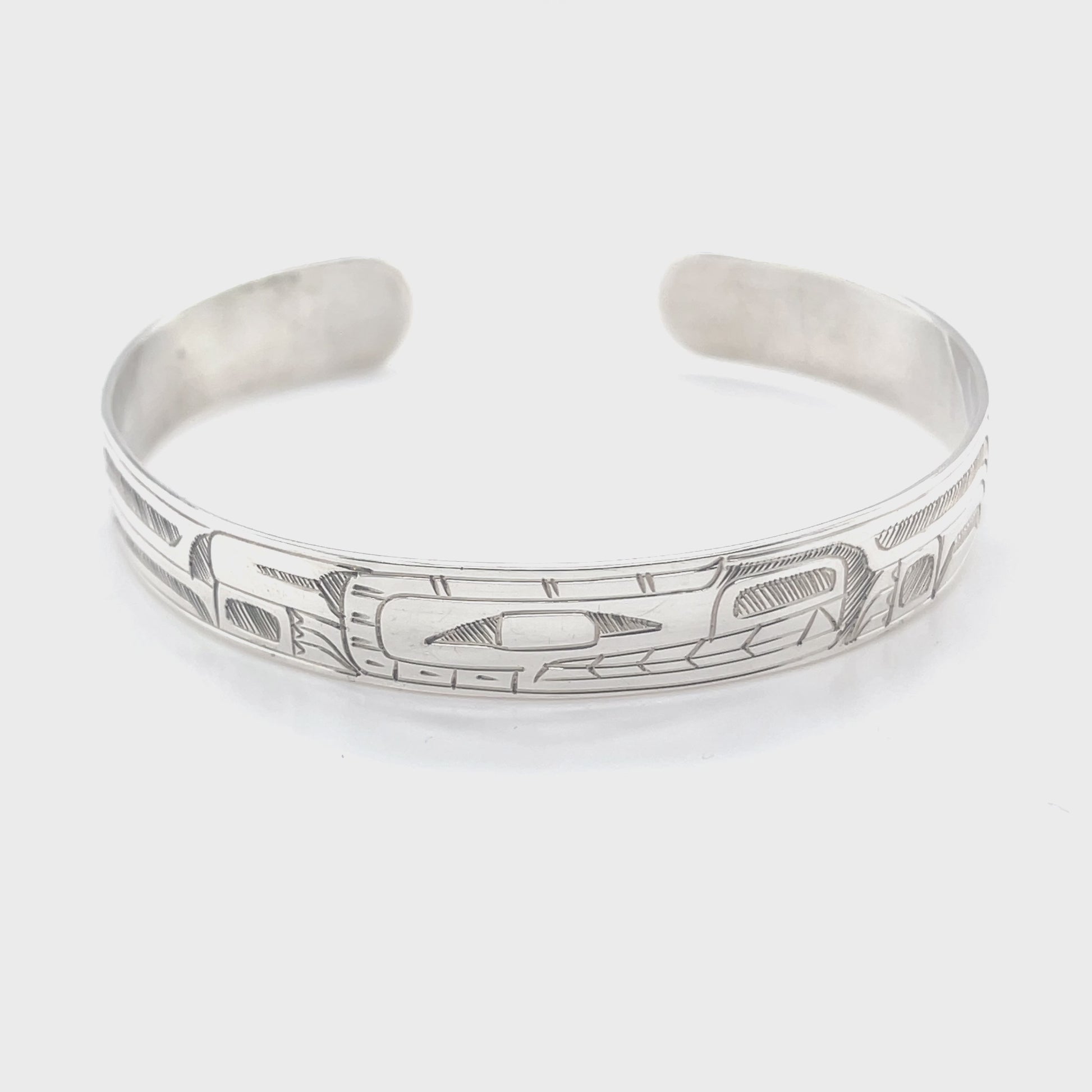 Gilbert Pat, born in Sardis, British Columbia in 1945, is a well-known Northwest Coast jewelry artist of the Coast Salish Nation. After moving to Alert Bay and working as a carpenter and commercial fisherman, he began carving in 1976. He is mainly self-taught, but was mentored by Lloyd Wadhams Sr. of the celebrated Seaweed and Shaughnessy families, from whom he learned to carve with fine detail and high craftsmanship. He works primarily in silver, and his work is widely recognized for its whimsical carvings that incorporate traditional Salish design elements.