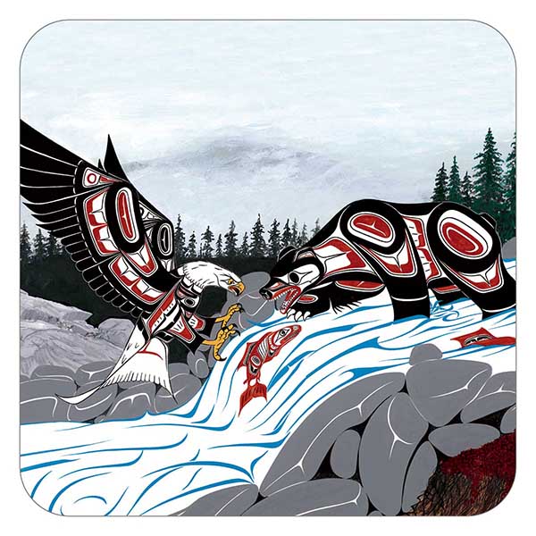 Coasters are made from MDF (medium-density fibreboard) with a cork backing. The artist's name, tribal affiliation, and title of the design appear on the box.
