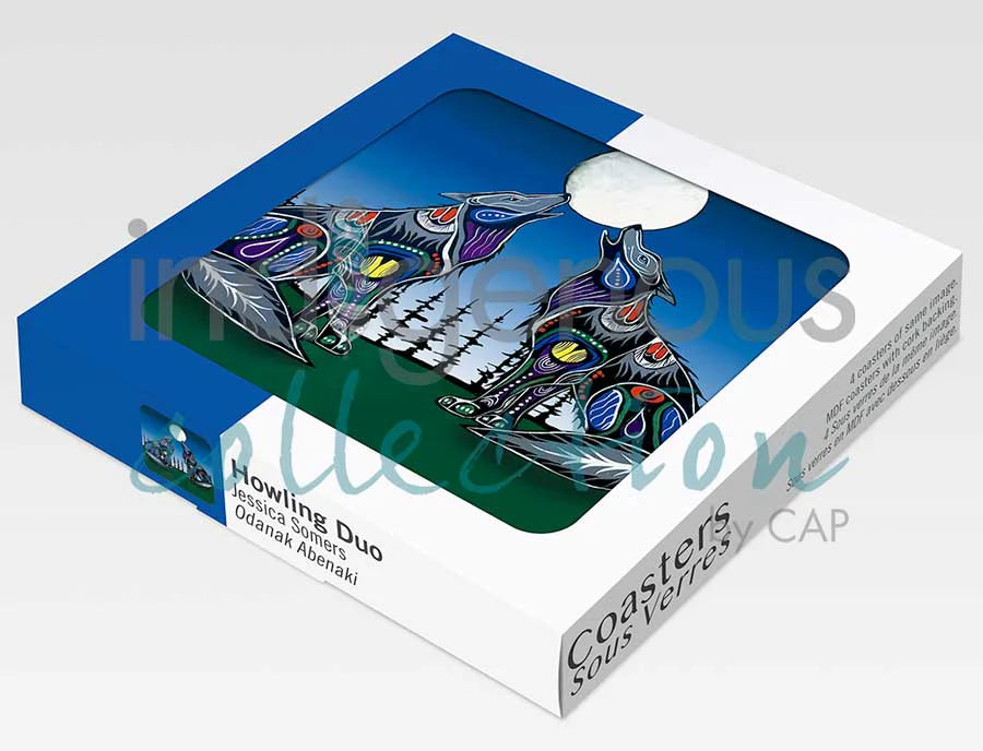 Coasters are made from MDF (medium-density fibreboard) with a cork backing. The artist's name, tribal affiliation, and title of the design appear on the box.