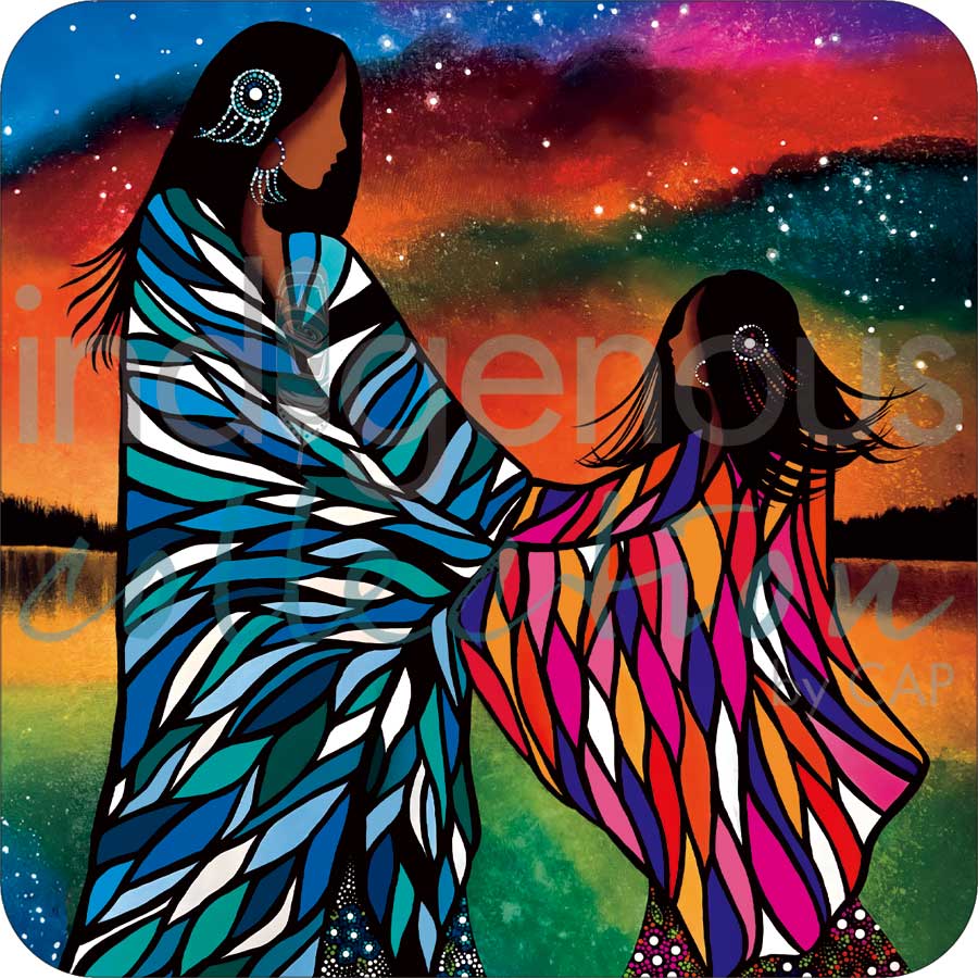 Coasters are made from MDF (medium-density fibreboard) with a cork backing. The artist's name, tribal affiliation, and title of the design appear on the box.