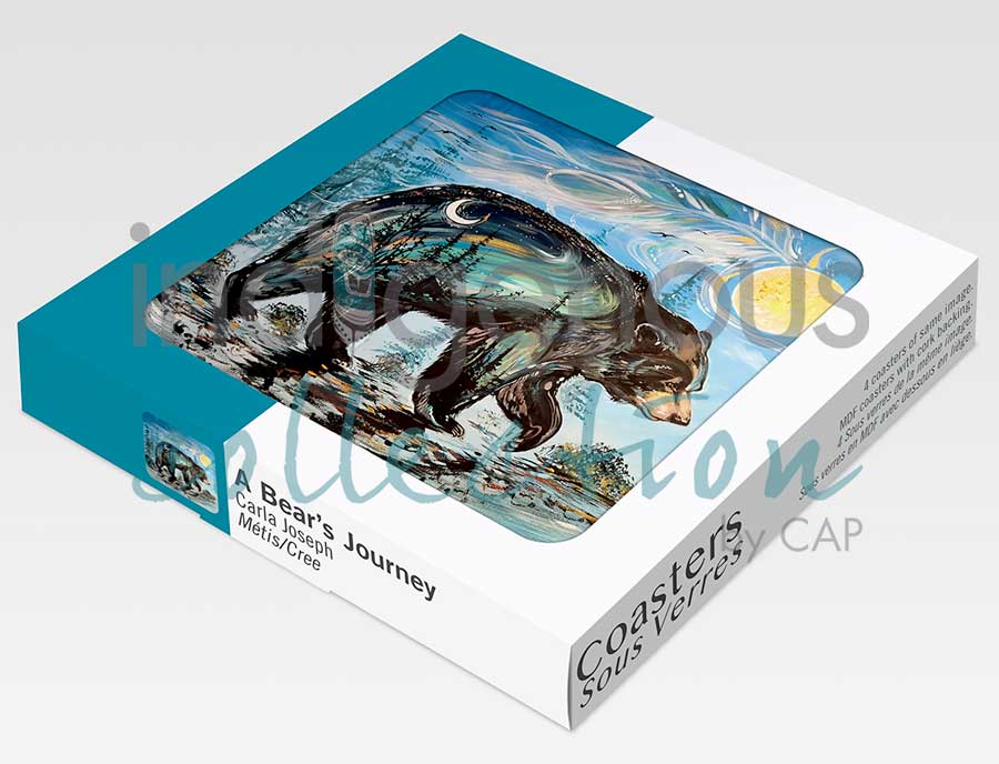 Coasters are made from MDF (medium-density fibreboard) with a cork backing. The artist's name, tribal affiliation, and title of the design appear on the box.
