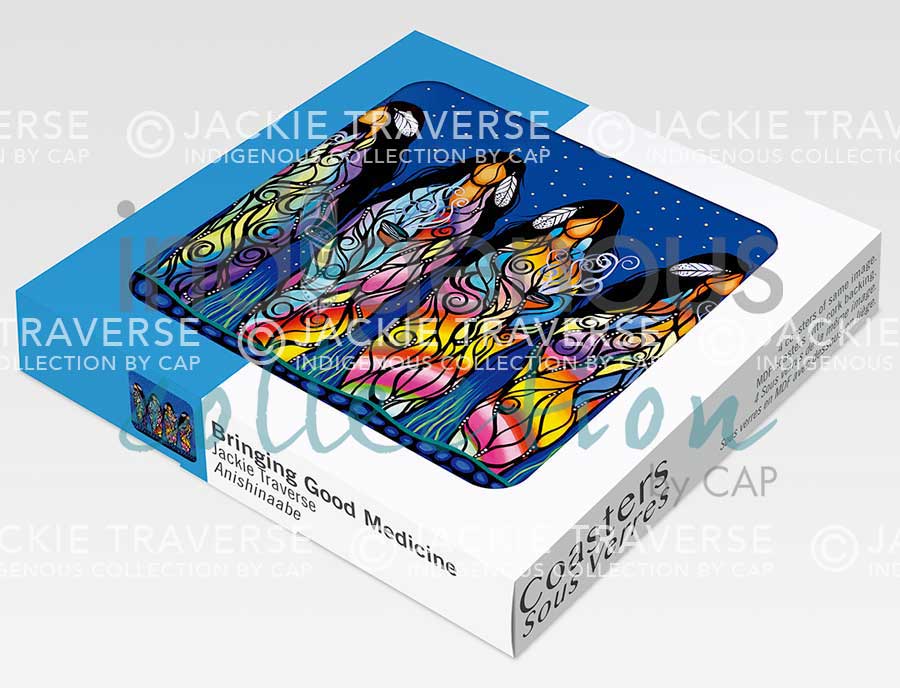Coasters are made from MDF (medium-density fibreboard) with a cork backing. The artist's name, tribal affiliation, and title of the design appear on the box.