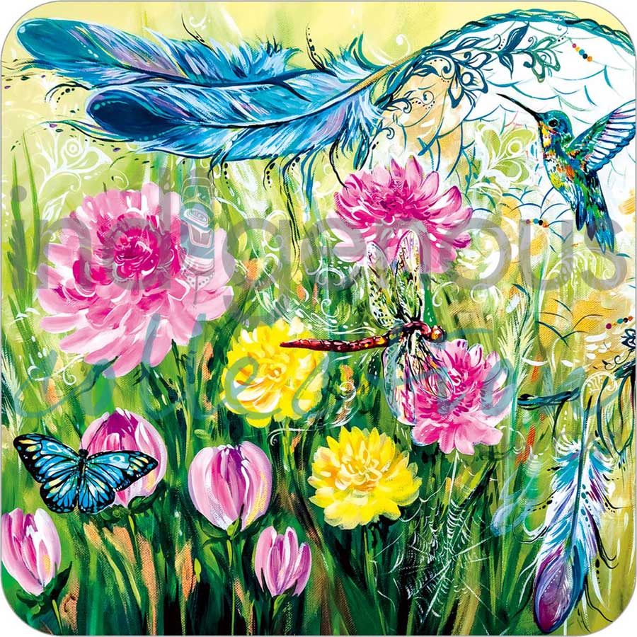 Coasters are made from MDF (medium-density fibreboard) with a cork backing. The artist's name, tribal affiliation, and title of the design appear on the box.