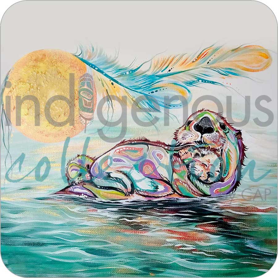 Coasters are made from MDF (medium-density fibreboard) with a cork backing. The artist's name, tribal affiliation, and title of the design appear on the box.