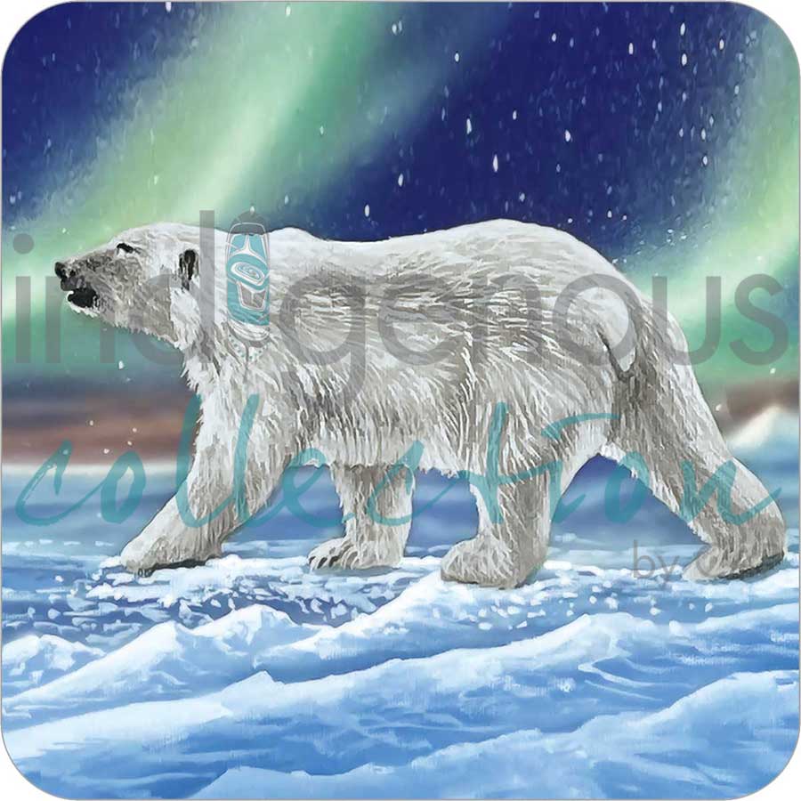 Coasters are made from MDF (medium-density fibreboard) with a cork backing. The artist's name, tribal affiliation, and title of the design appear on the box.