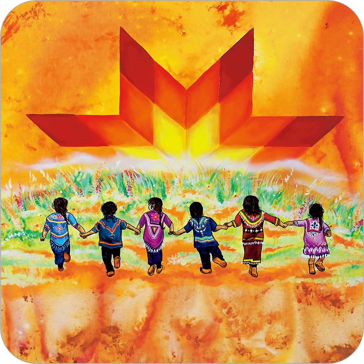 Coasters are made from MDF (medium-density fibreboard) with a cork backing. The artist's name, tribal affiliation, and title of the design appear on the box.