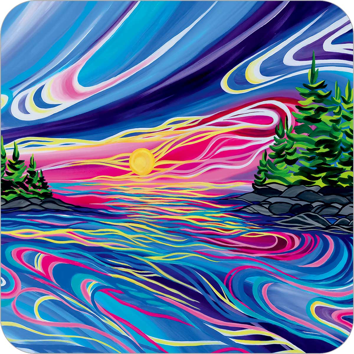 Coasters are made from MDF (medium-density fibreboard) with a cork backing. The artist's name, tribal affiliation, and title of the design appear on the box.