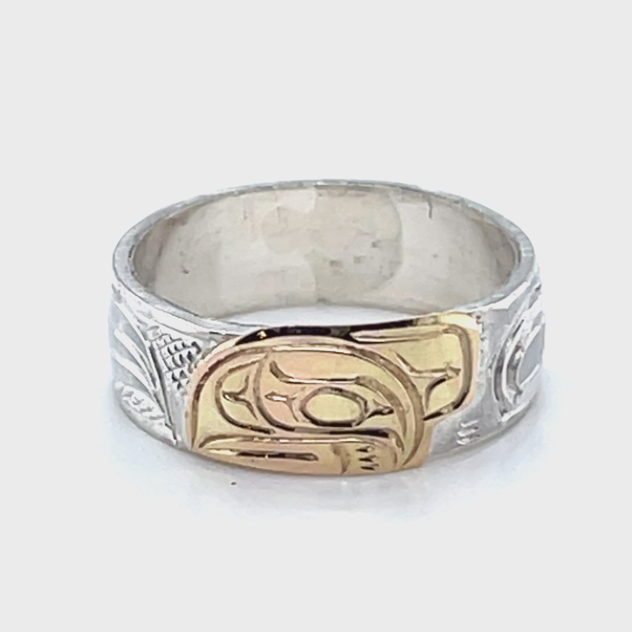 Mike Matilpi, born in Alert Bay to the Kwakwaka’wakw Nation and a family of revered wood and jewellery carvers, has been carving silver and gold jewellery since 1993. He was taught by his father, Charles Harper, himself a well-known carver who has been working since 1974. Mike has also been greatly influenced by other relatives of his, such as Doug Harper, Glen Harper, Les Harper, George Matilpi, Dennis Matilpi, and Paddy Seaweed. He has taken many specialized courses in silversmithing to further his craft, including bezel stone setting. His work can be recognized by the masterful combination of gold and silver and the charming and traditional animal designs.