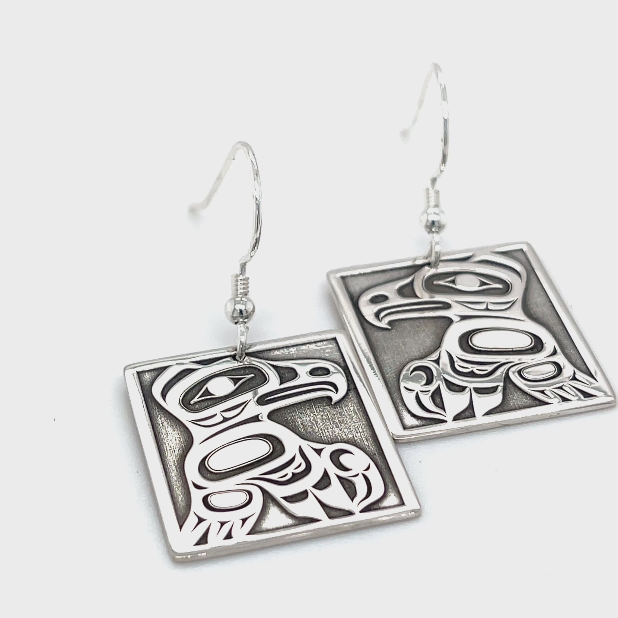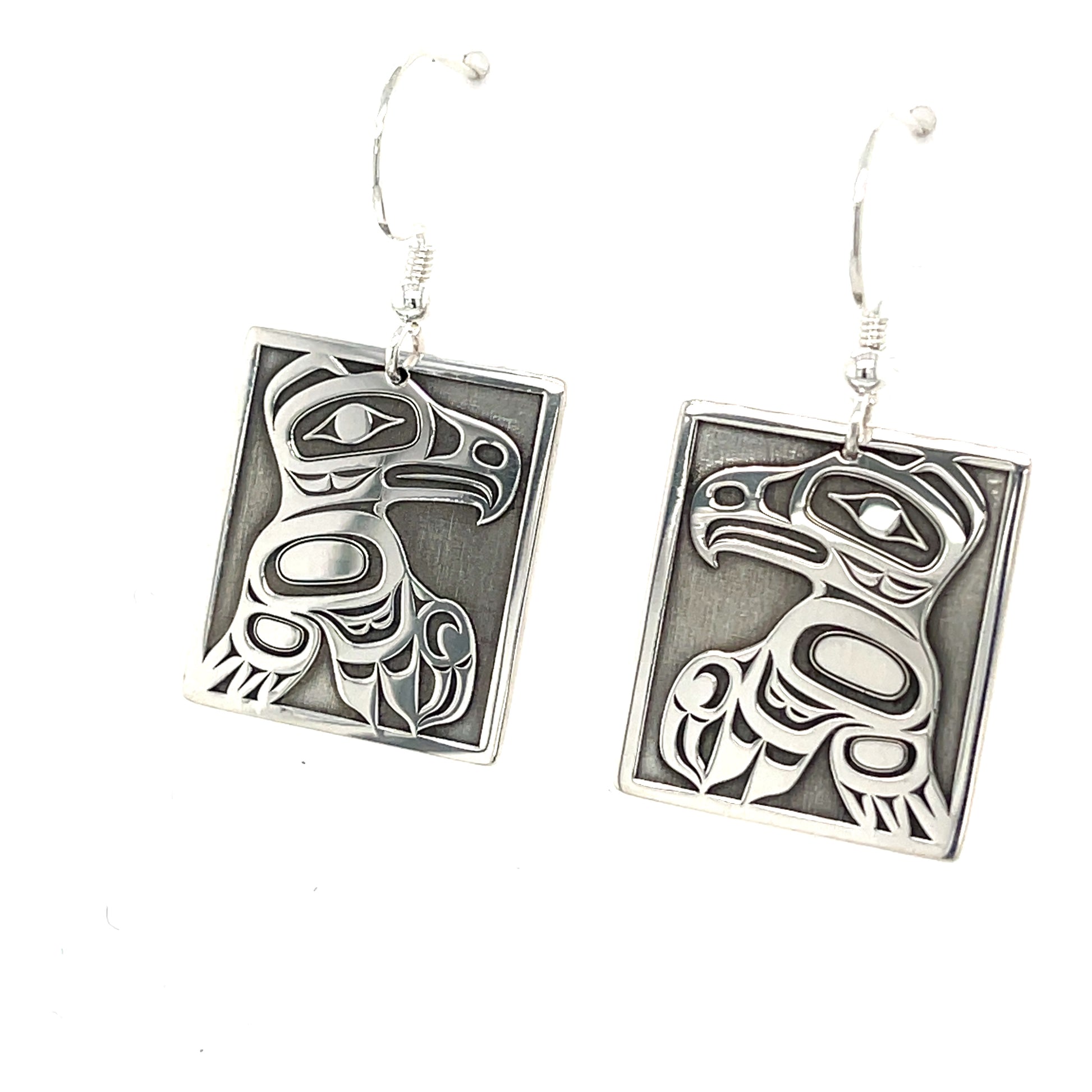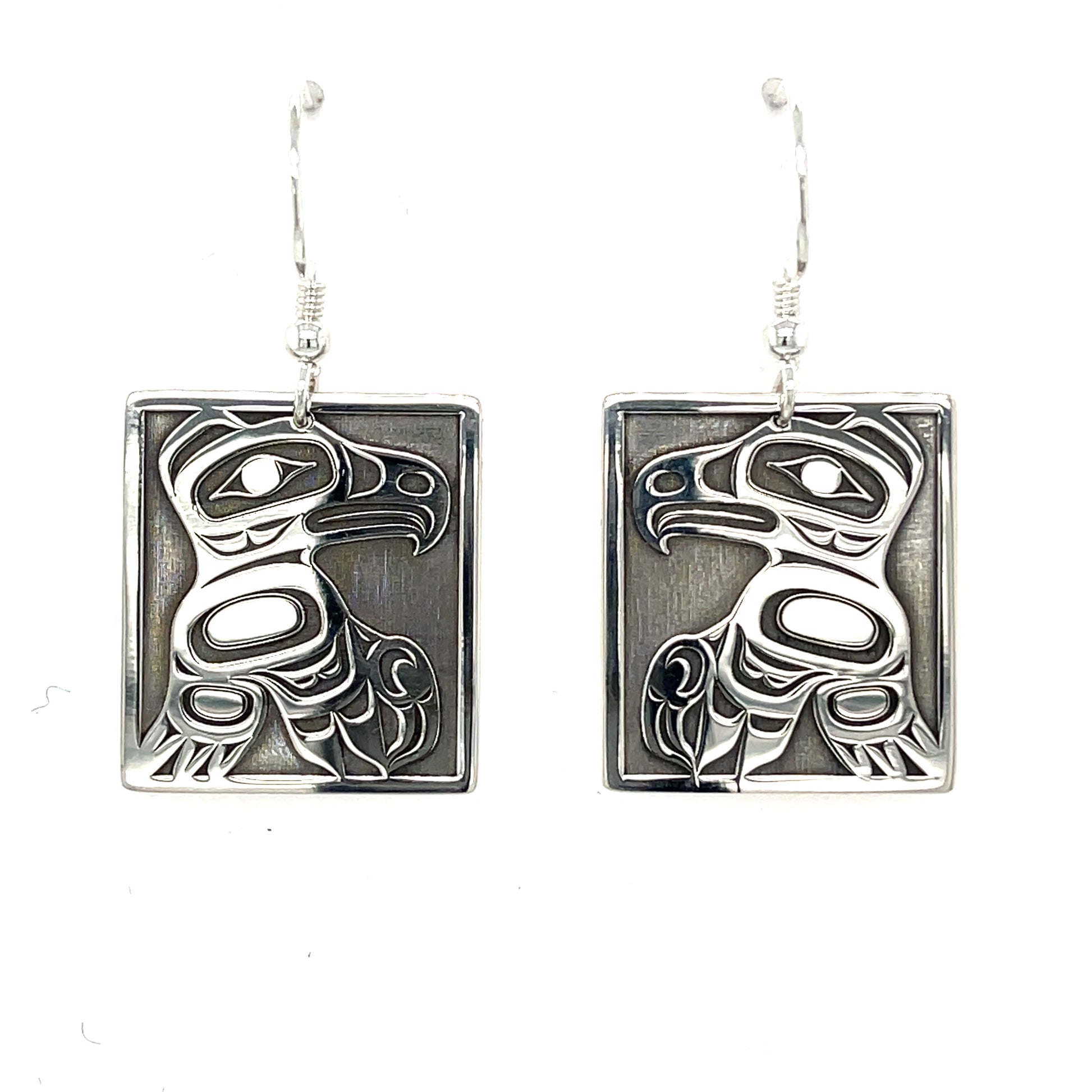 Sterling silver earrings, laser-engraved with intricate Indigenous designs.