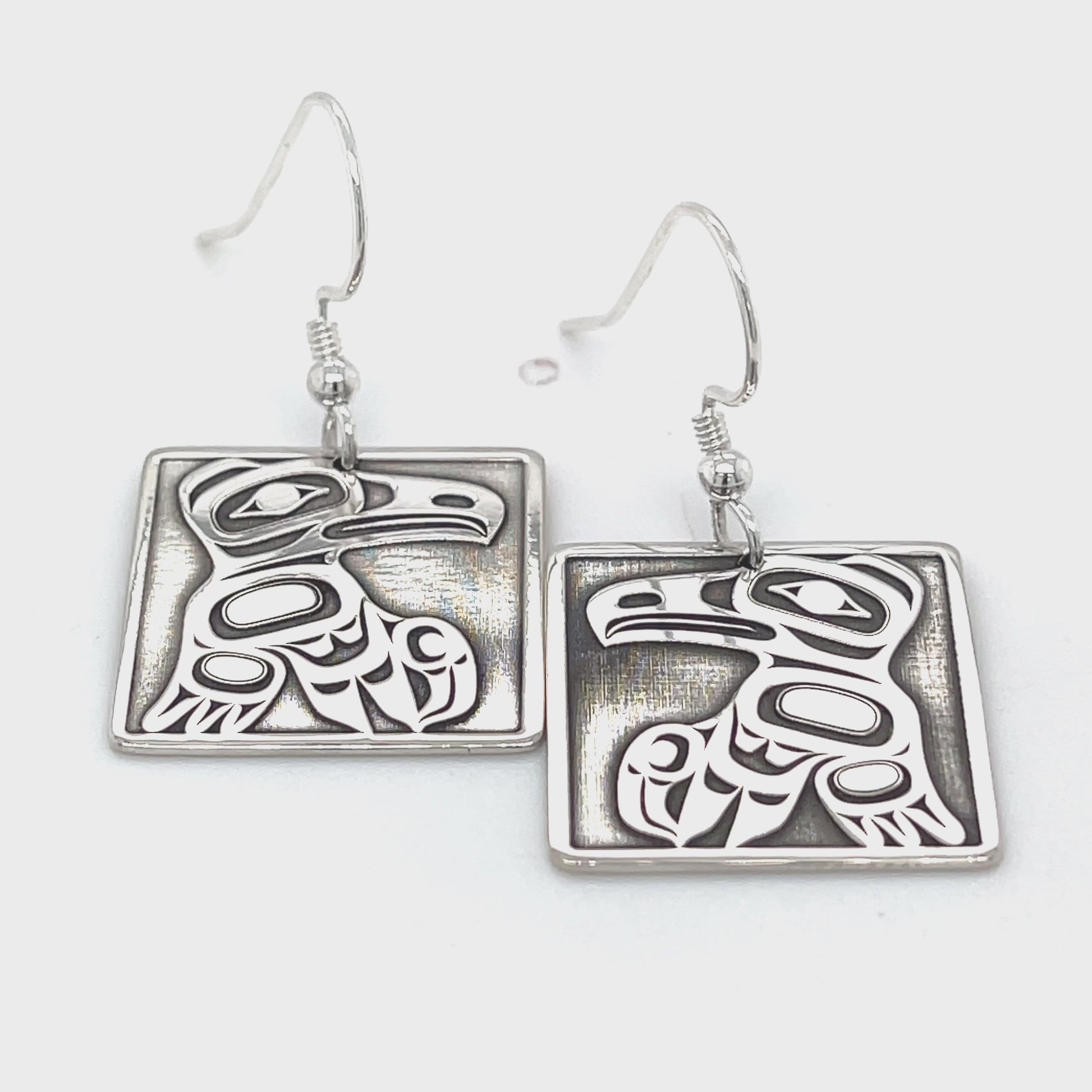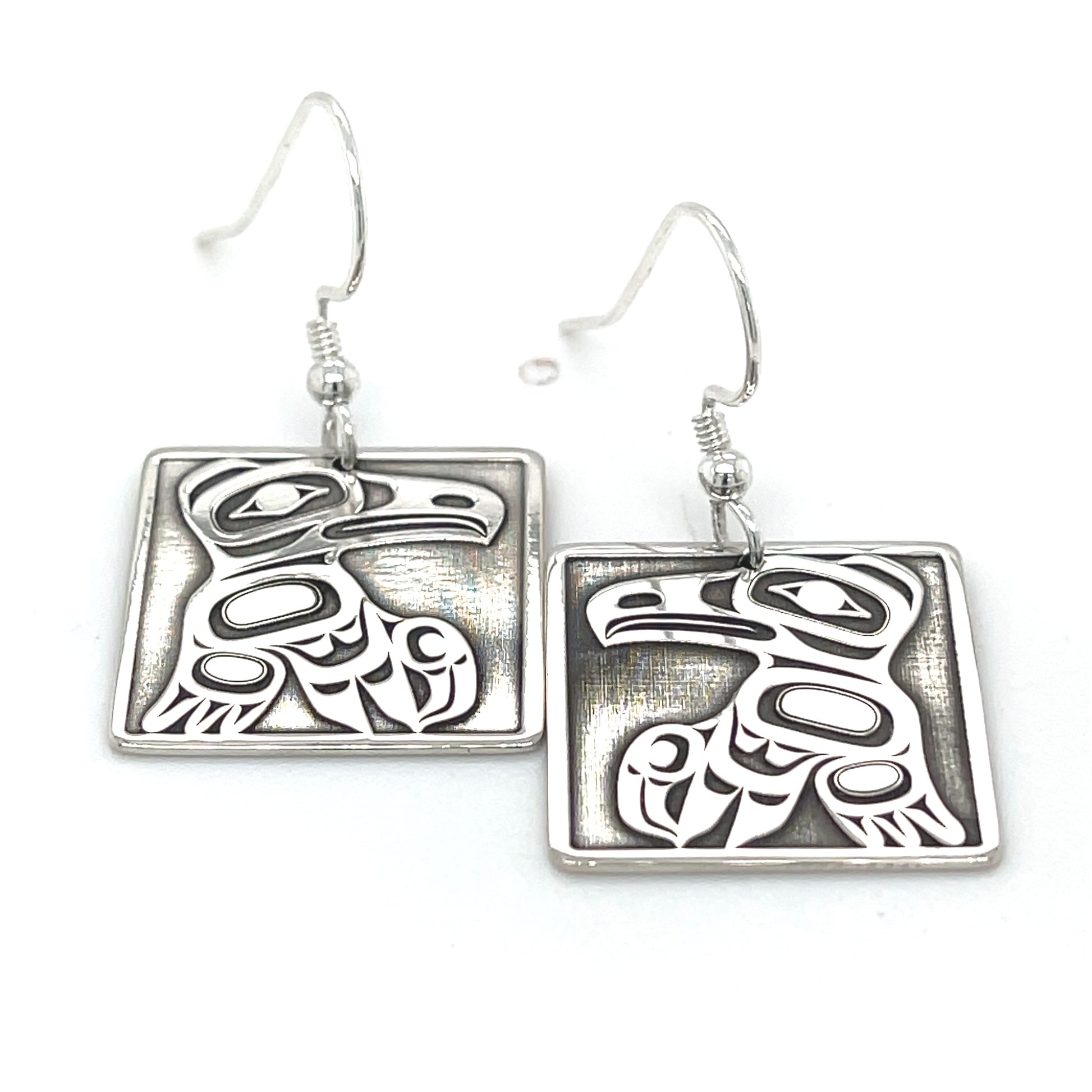 Sterling silver earrings, laser-engraved with intricate Indigenous designs.
