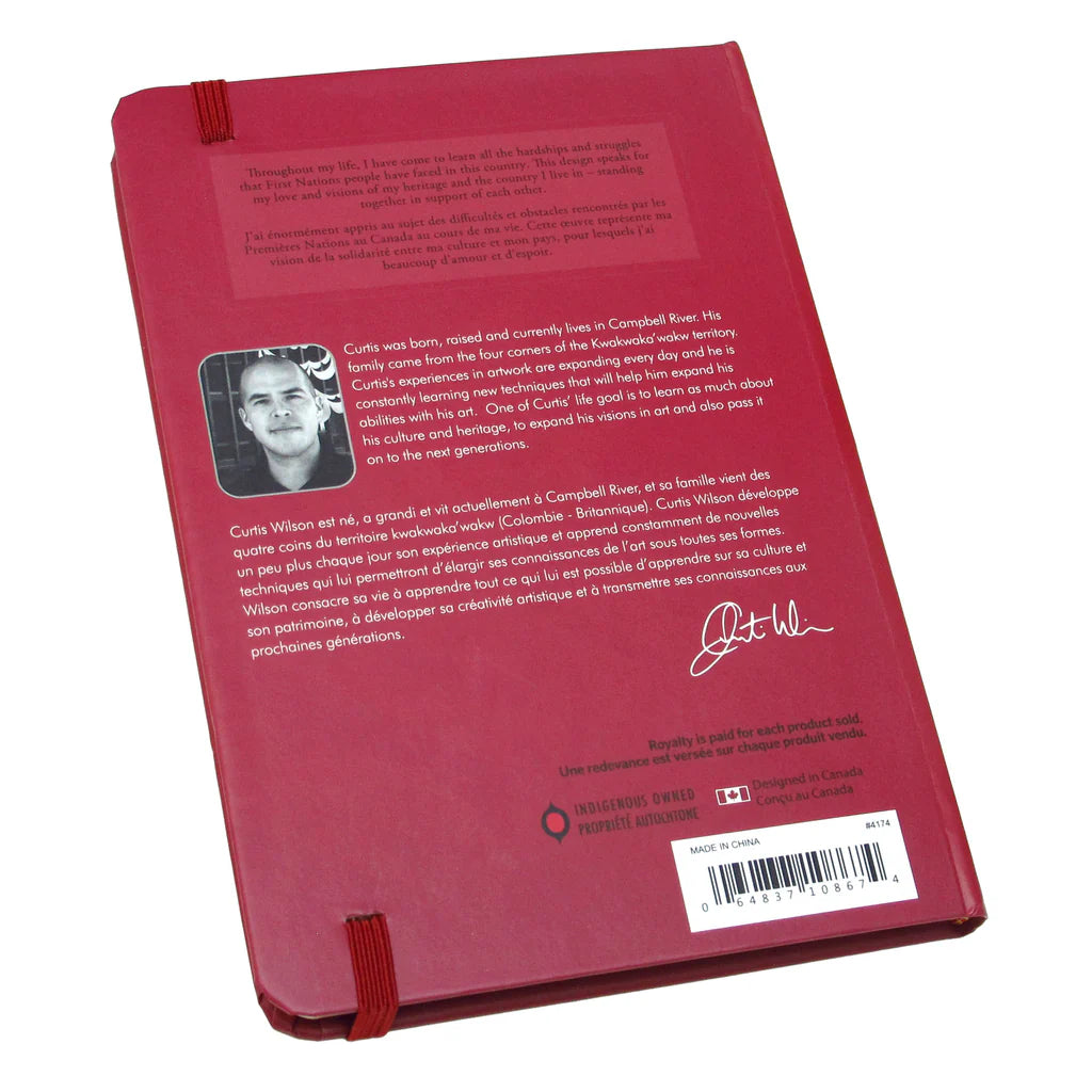 A killer whale is within the maple leaf and the red bands are each with a salmon design. Throughout my life, I have come to learn all the hardships and struggles that First Nations people have faced in this country. This design speaks for my love and visions of my heritage and the country I live in– standing together in support of each other.