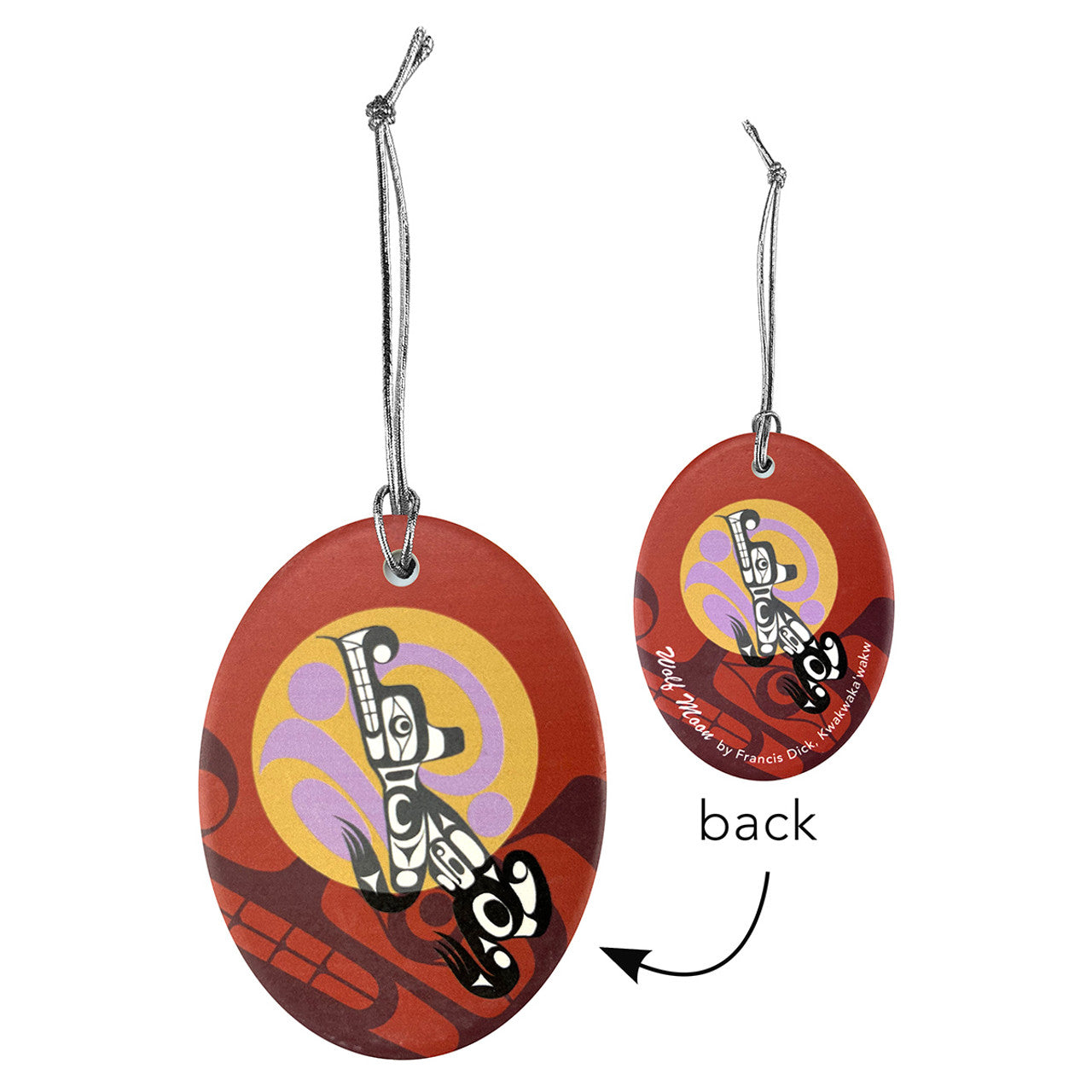 Bring artistry to your holiday décor with our Ceramic Ornaments, available in classic circle (3” x 3”) and elegant oval (2.4” x 3.2”) shapes. Each ornament is beautifully printed on both sides, with the artist’s information thoughtfully displayed on the back, creating a keepsake that celebrates Indigenous art and culture. The smooth matte finish enhances the artwork, adding a refined touch, and each ornament comes ready to hang with a sleek silver string. Individually packaged with a header card, these ornaments make perfect gifts or timeless additions to your own seasonal collection.