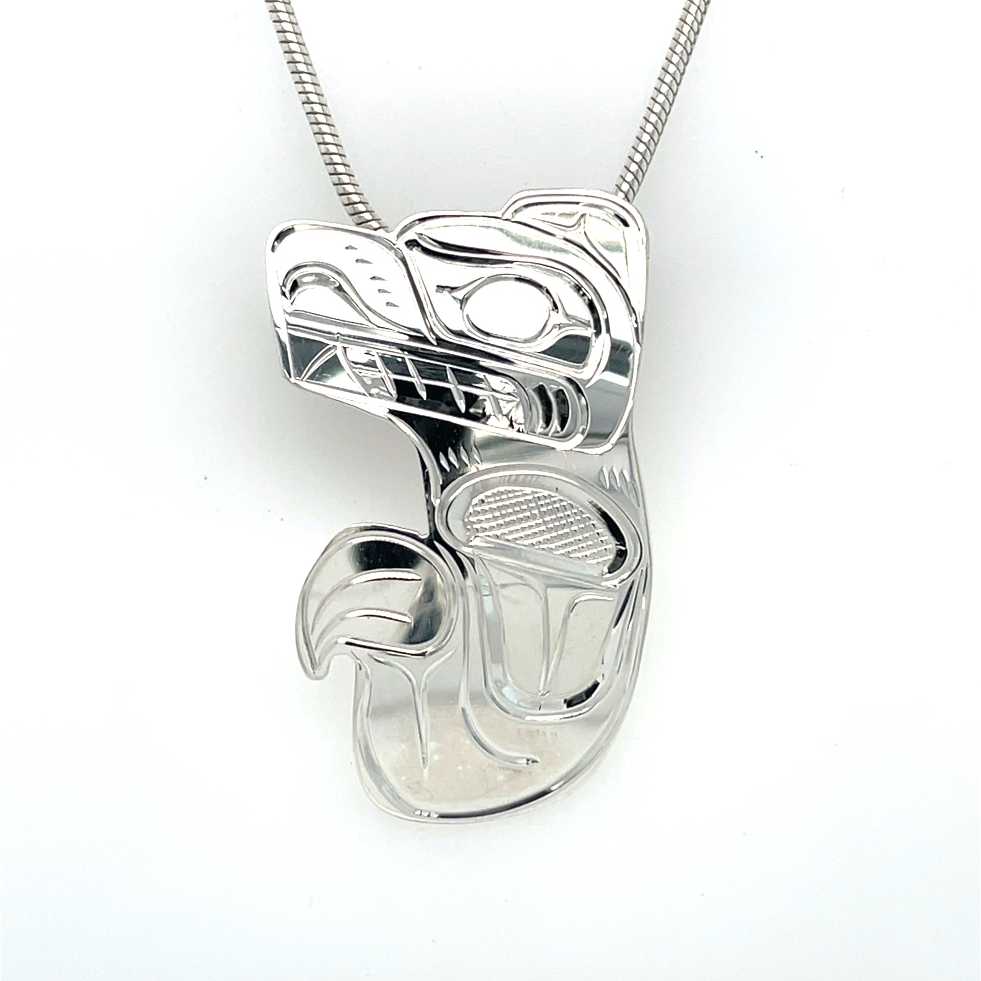 Mike Matilpi, born in Alert Bay to the Kwakwaka’wakw Nation and a family of revered wood and jewellery carvers, has been carving silver and gold jewellery since 1993. He was taught by his father, Charles Harper, himself a well-known carver who has been working since 1974. Mike has also been greatly influenced by other relatives of his, such as Doug Harper, Glen Harper, Les Harper, George Matilpi, Dennis Matilpi, and Paddy Seaweed. He has taken many specialized courses in silversmithing to further his craft, including bezel stone setting. His work can be recognized by the masterful combination of gold and silver and the charming and traditional animal designs.