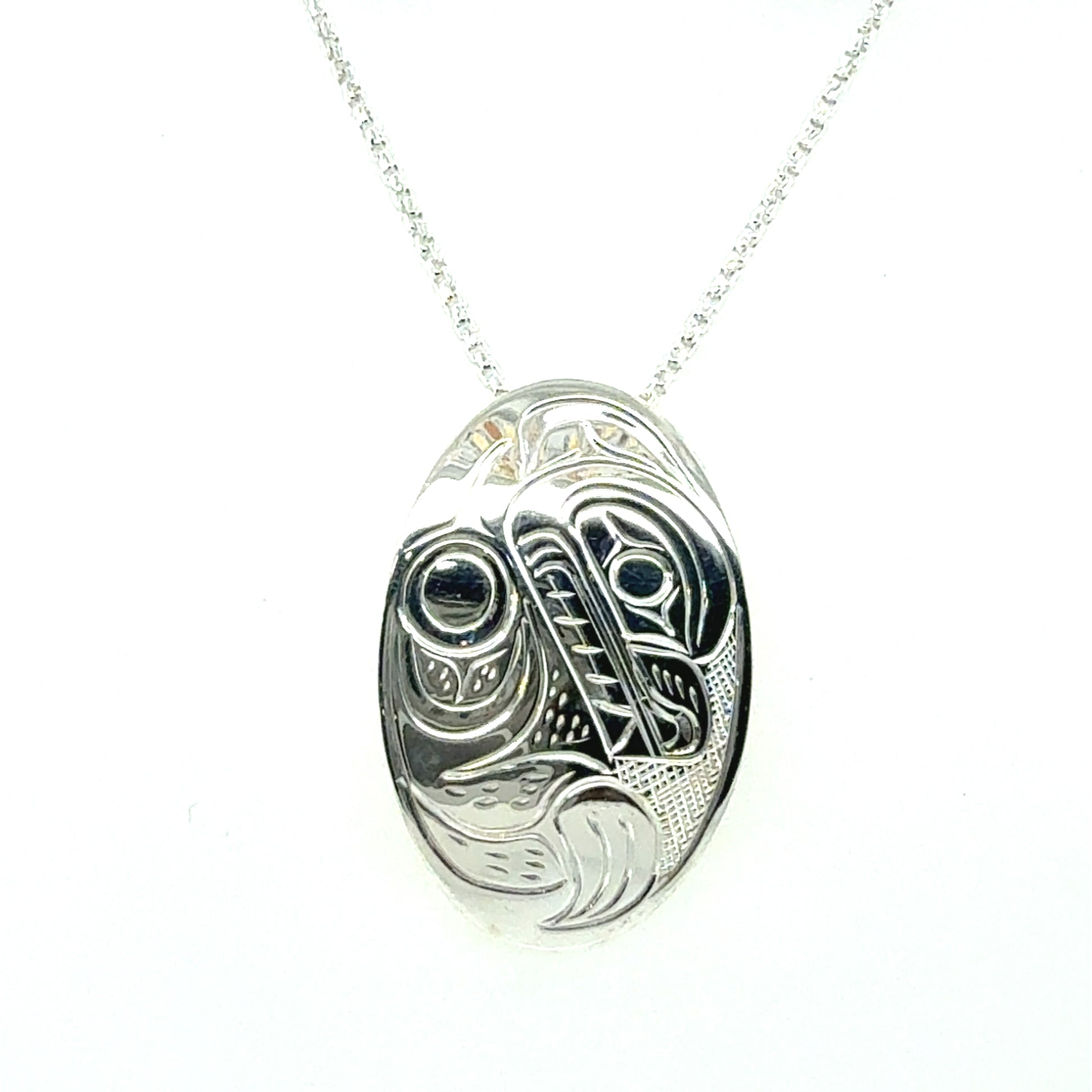 Mike Matilpi, born in Alert Bay to the Kwakwaka’wakw Nation and a family of revered wood and jewellery carvers, has been carving silver and gold jewellery since 1993. He was taught by his father, Charles Harper, himself a well-known carver who has been working since 1974. Mike has also been greatly influenced by other relatives of his, such as Doug Harper, Glen Harper, Les Harper, George Matilpi, Dennis Matilpi, and Paddy Seaweed. He has taken many specialized courses in silversmithing to further his craft, including bezel stone setting. His work can be recognized by the masterful combination of gold and silver and the charming and traditional animal designs.