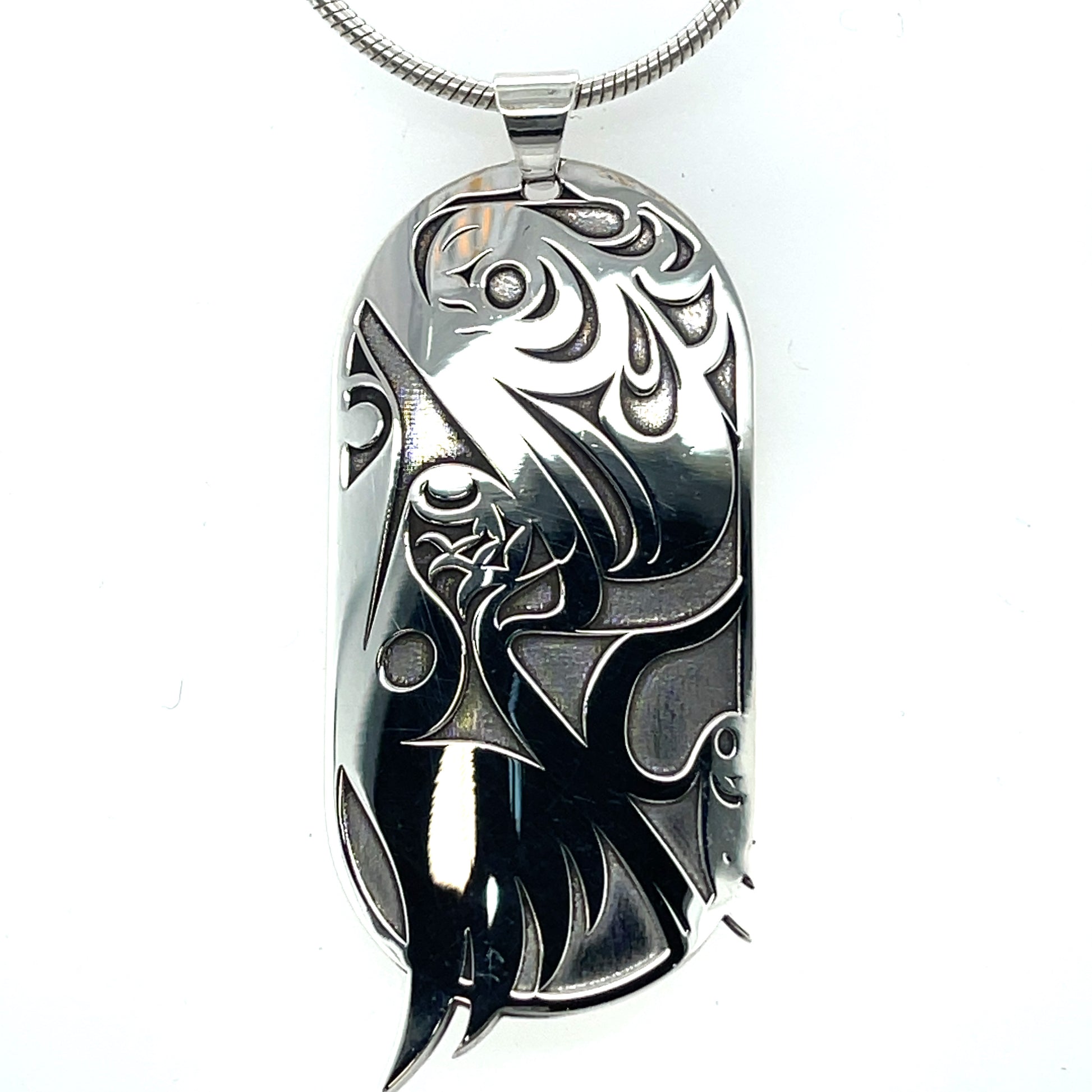 This piece of Indigenous jewellery has been laser-engraved. The craft of laser-engraved silver jewellery involves a sophisticated process which allows highly skilled artisans to bring their designs to life with utmost precision, durability, and intricacy. It is both meticulous and hands-on at every step: from the initial sketch, laser programming and engraving, to the cleaning and polishing of each completed, individual piece.