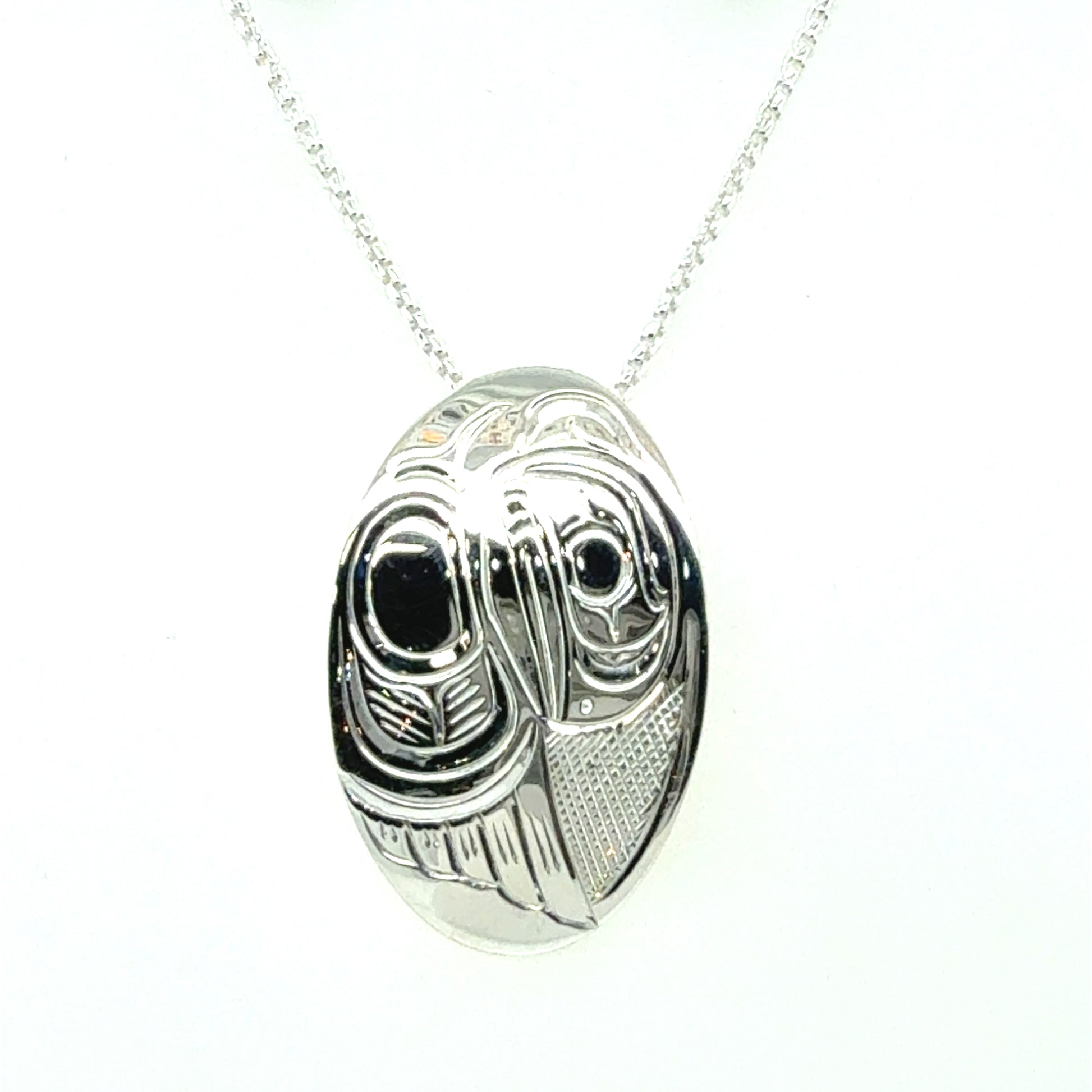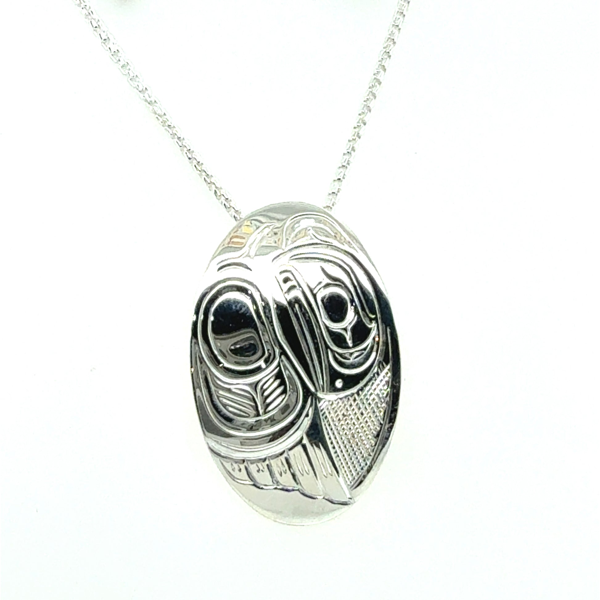 Mike Matilpi, born in Alert Bay to the Kwakwaka’wakw Nation and a family of revered wood and jewellery carvers, has been carving silver and gold jewellery since 1993. He was taught by his father, Charles Harper, himself a well-known carver who has been working since 1974. Mike has also been greatly influenced by other relatives of his, such as Doug Harper, Glen Harper, Les Harper, George Matilpi, Dennis Matilpi, and Paddy Seaweed. He has taken many specialized courses in silversmithing to further his craft, including bezel stone setting. His work can be recognized by the masterful combination of gold and silver and the charming and traditional animal designs.