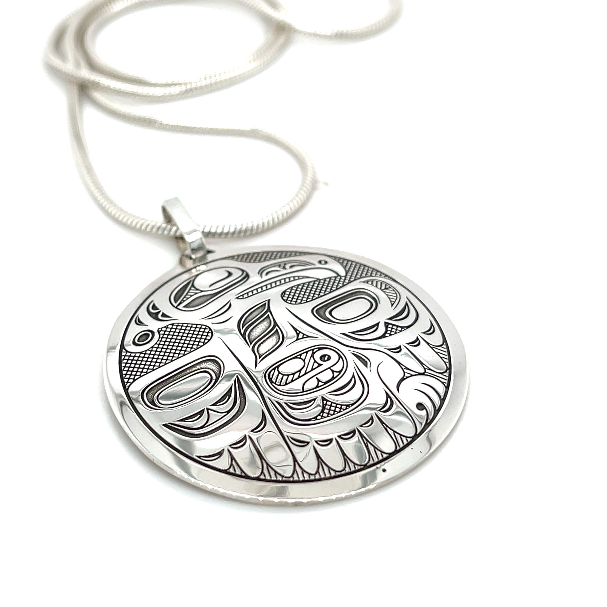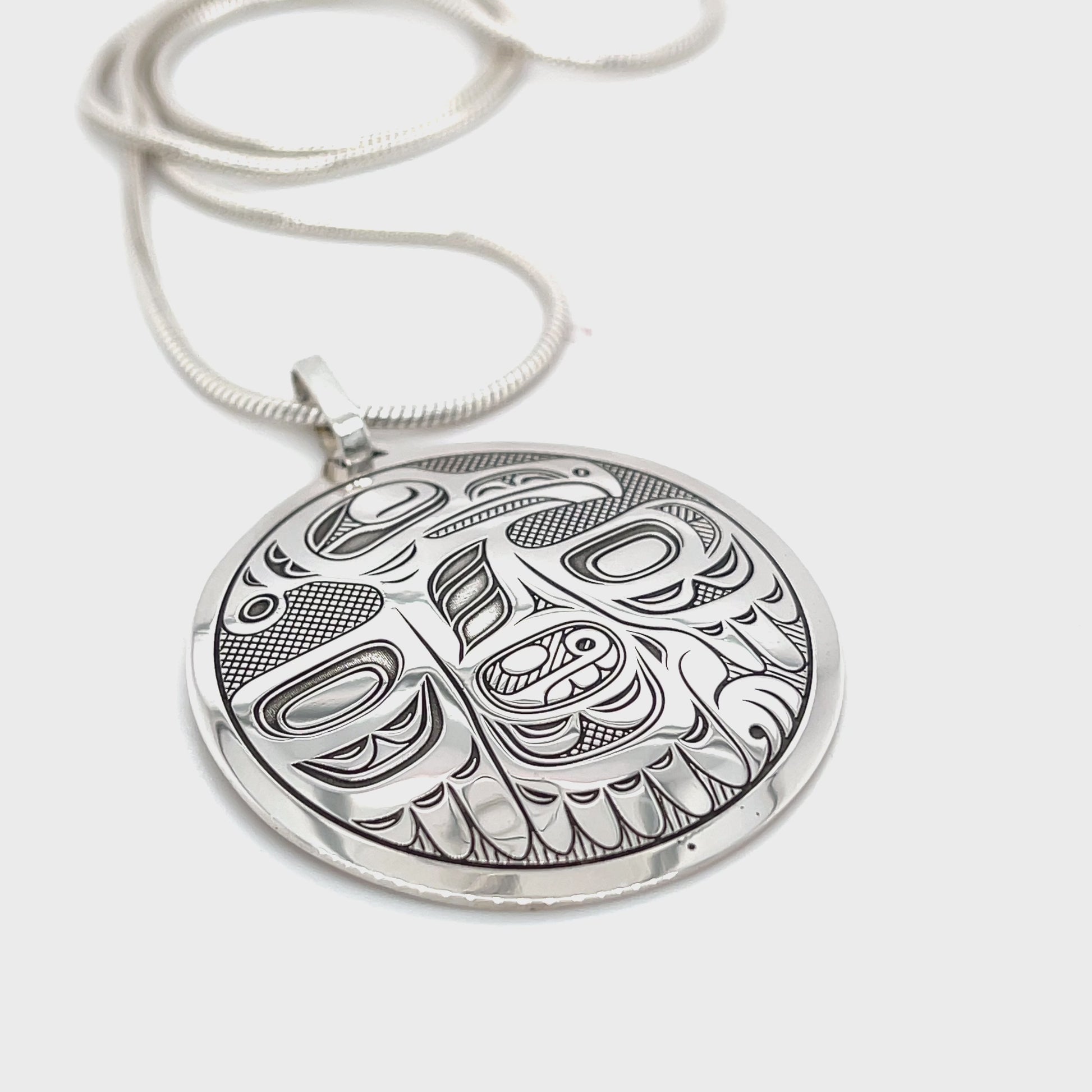 This sterling silver pendant by Gitxsan artist Art Sterritt (Myanxa) celebrates the Raven, a symbol of creativity, wisdom, knowledge, honour, and cleverness. Measuring 38mm high × 35mm wide, it features a laser-engraved design that captures intricate Indigenous motifs with precision and detail.