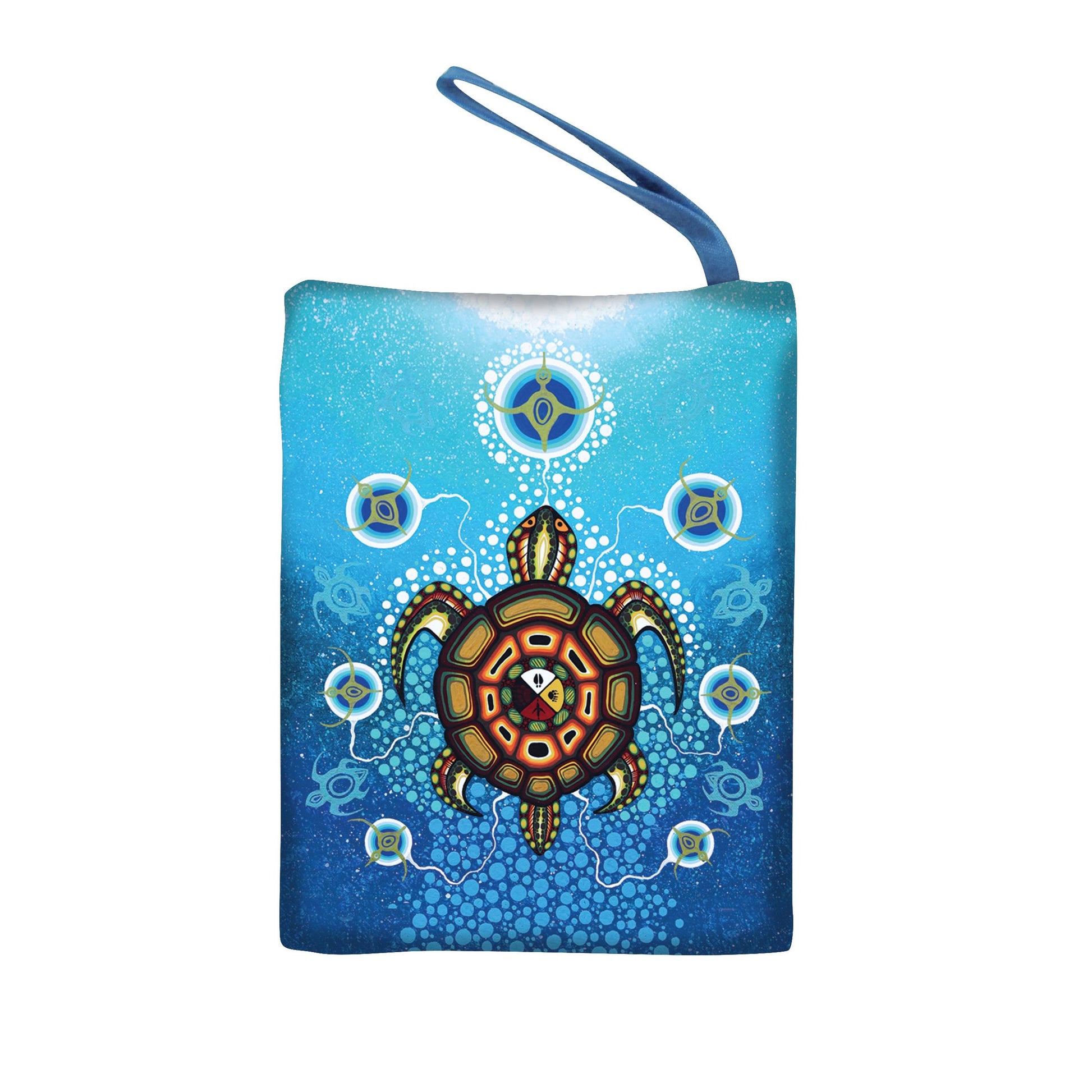 The Turtle is sacred in the indigenous culture. It carries the four colours of the medicine wheel, symbolizing important elements and can be different depending on the tribe. The seven circles represent the seven teachings of our people, and inside each circle is a bird that delivers the message of the creator.