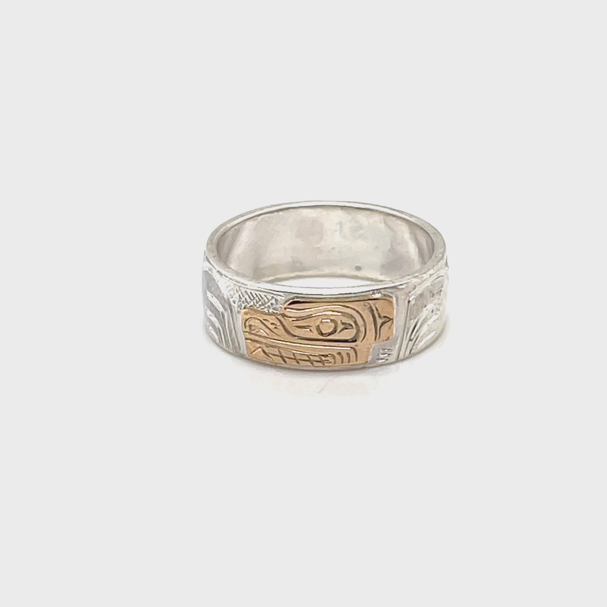 Mike Matilpi, born in Alert Bay to the Kwakwaka’wakw Nation and a family of revered wood and jewellery carvers, has been carving silver and gold jewellery since 1993. He was taught by his father, Charles Harper, himself a well-known carver who has been working since 1974. Mike has also been greatly influenced by other relatives of his, such as Doug Harper, Glen Harper, Les Harper, George Matilpi, Dennis Matilpi, and Paddy Seaweed. He has taken many specialized courses in silversmithing to further his craft, including bezel stone setting. His work can be recognized by the masterful combination of gold and silver and the charming and traditional animal designs.