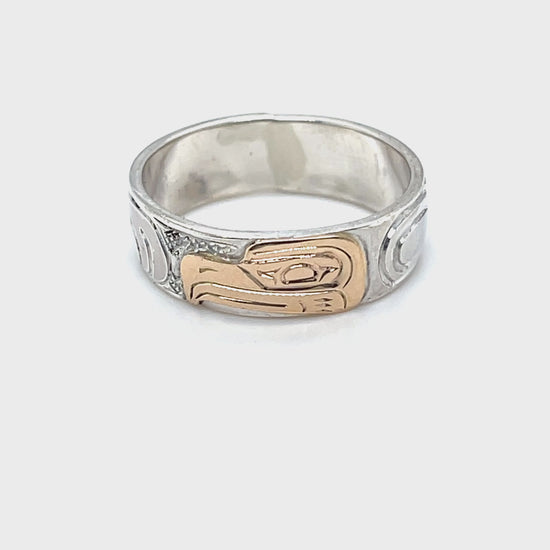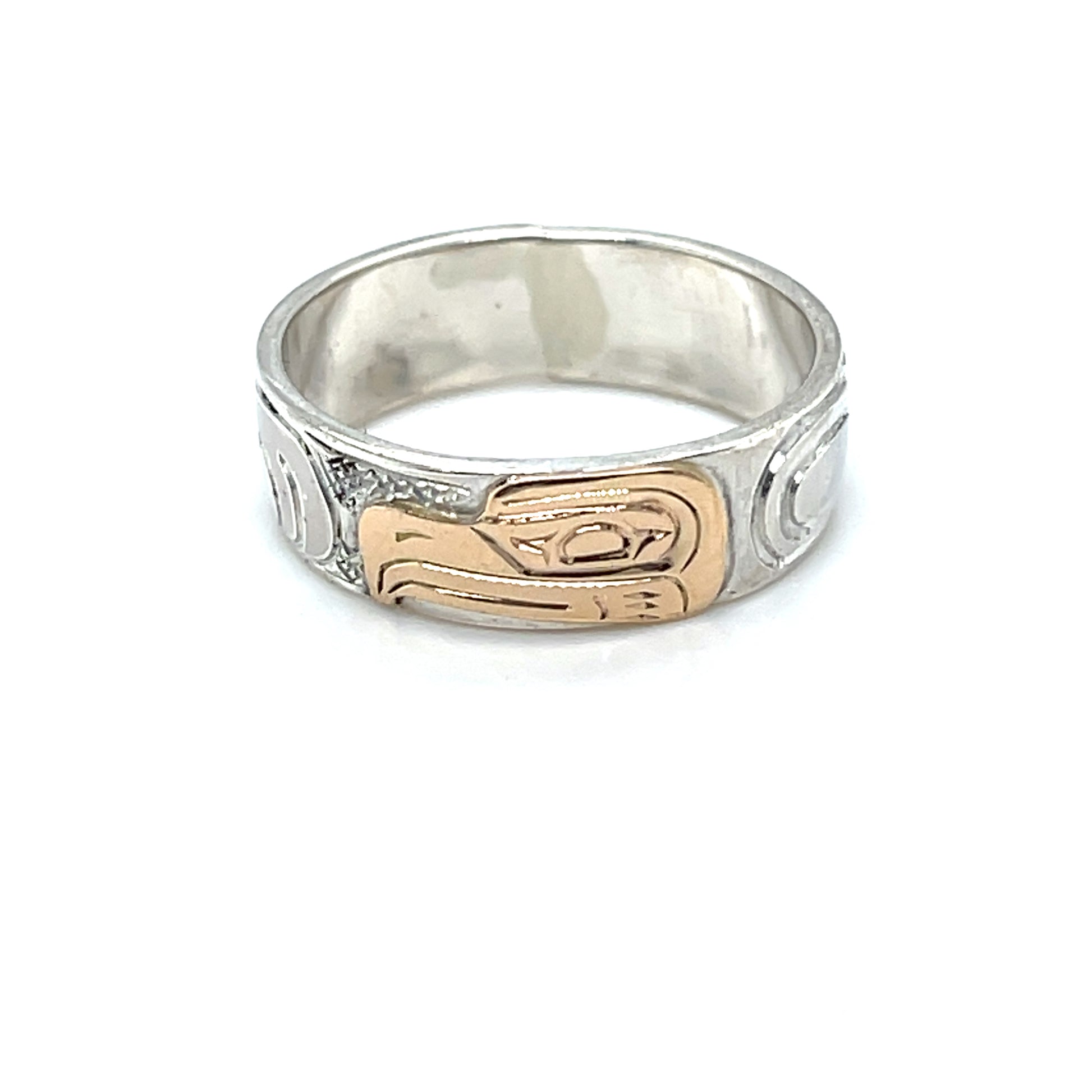 Mike Matilpi, born in Alert Bay to the Kwakwaka’wakw Nation and a family of revered wood and jewellery carvers, has been carving silver and gold jewellery since 1993. He was taught by his father, Charles Harper, himself a well-known carver who has been working since 1974. Mike has also been greatly influenced by other relatives of his, such as Doug Harper, Glen Harper, Les Harper, George Matilpi, Dennis Matilpi, and Paddy Seaweed. He has taken many specialized courses in silversmithing to further his craft, including bezel stone setting. His work can be recognized by the masterful combination of gold and silver and the charming and traditional animal designs.