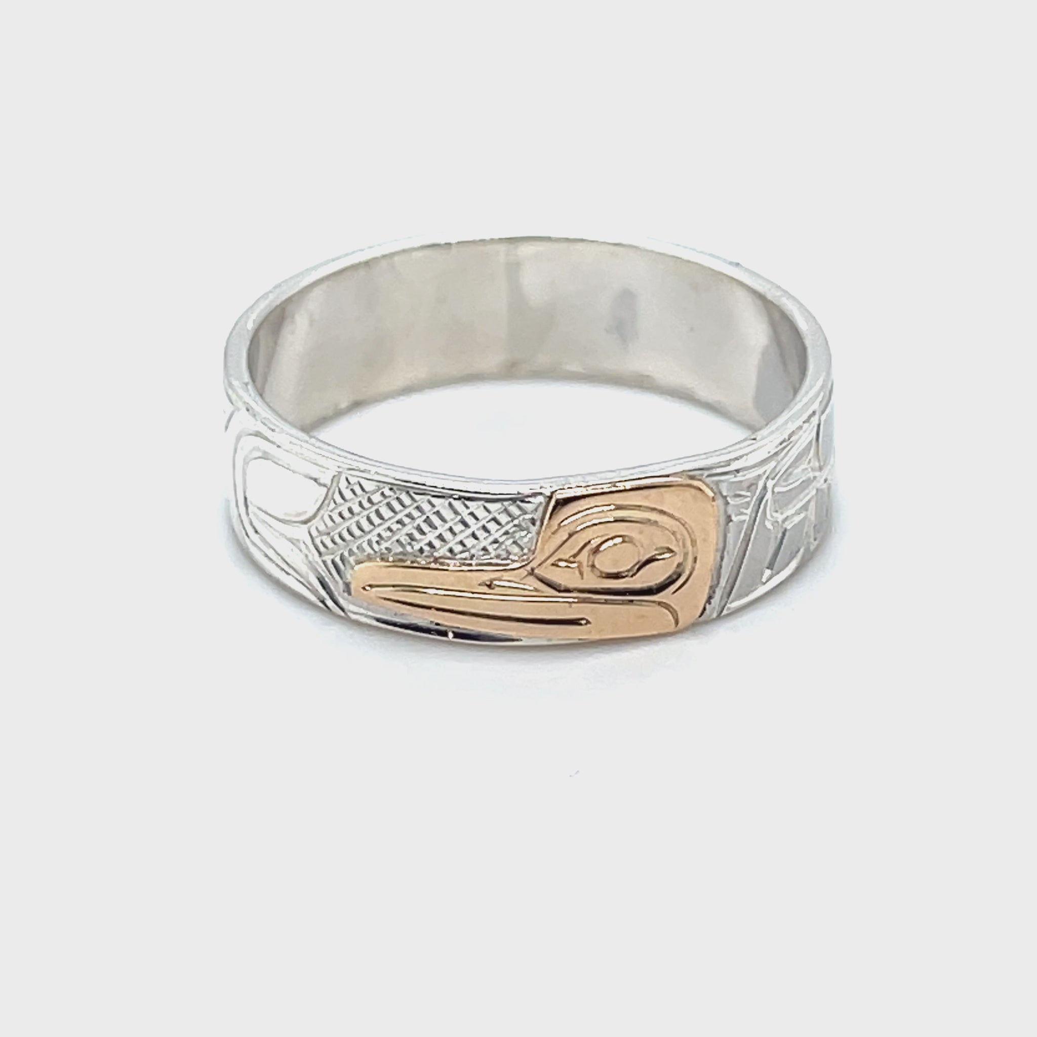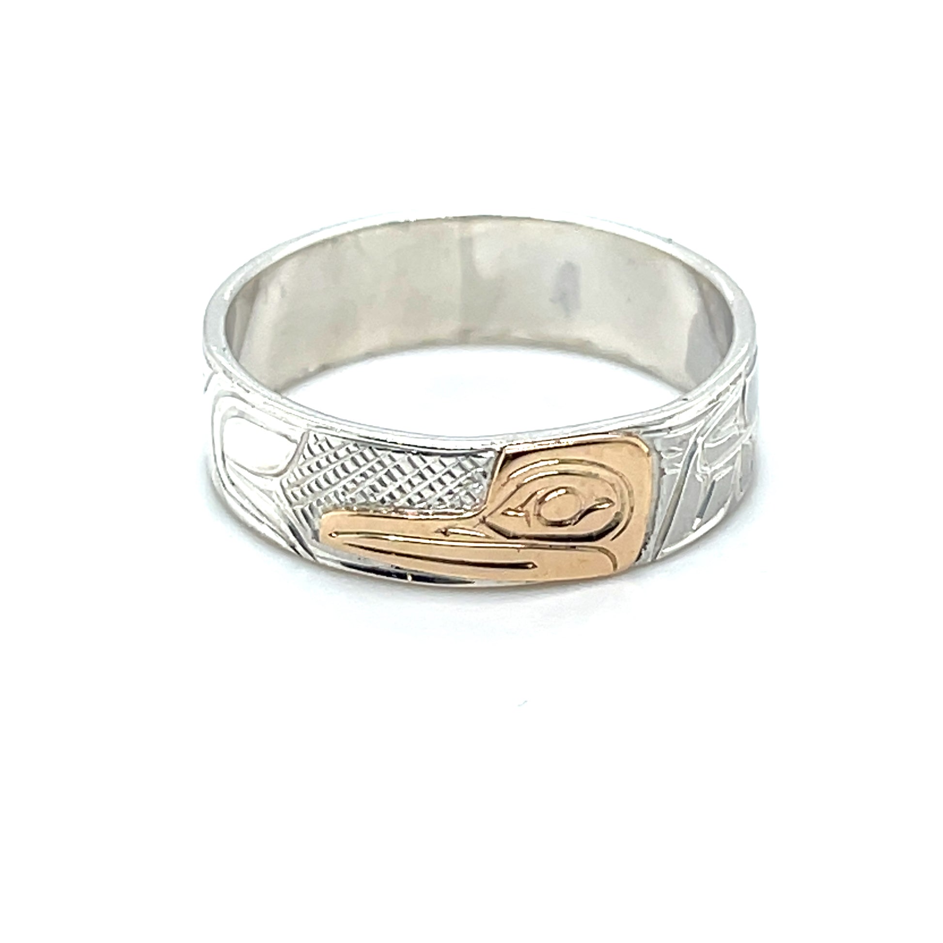 Mike Matilpi, born in Alert Bay to the Kwakwaka’wakw Nation and a family of revered wood and jewellery carvers, has been carving silver and gold jewellery since 1993. He was taught by his father, Charles Harper, himself a well-known carver who has been working since 1974. Mike has also been greatly influenced by other relatives of his, such as Doug Harper, Glen Harper, Les Harper, George Matilpi, Dennis Matilpi, and Paddy Seaweed. He has taken many specialized courses in silversmithing to further his craft, including bezel stone setting. His work can be recognized by the masterful combination of gold and silver and the charming and traditional animal designs.