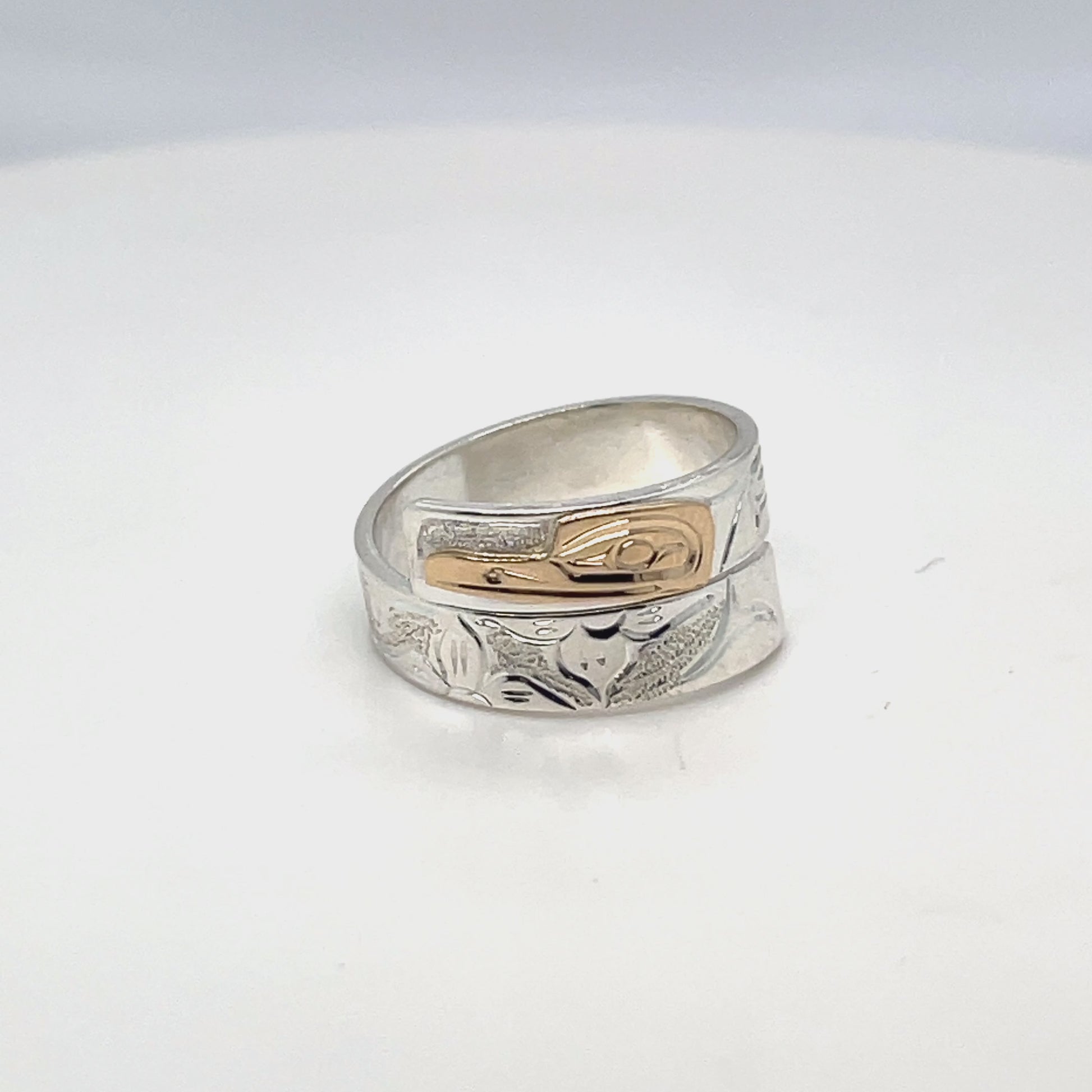 Mike Matilpi, born in Alert Bay to the Kwakwaka’wakw Nation and a family of revered wood and jewellery carvers, has been carving silver and gold jewellery since 1993. He was taught by his father, Charles Harper, himself a well-known carver who has been working since 1974. Mike has also been greatly influenced by other relatives of his, such as Doug Harper, Glen Harper, Les Harper, George Matilpi, Dennis Matilpi, and Paddy Seaweed. He has taken many specialized courses in silversmithing to further his craft, including bezel stone setting. His work can be recognized by the masterful combination of gold and silver and the charming and traditional animal designs.