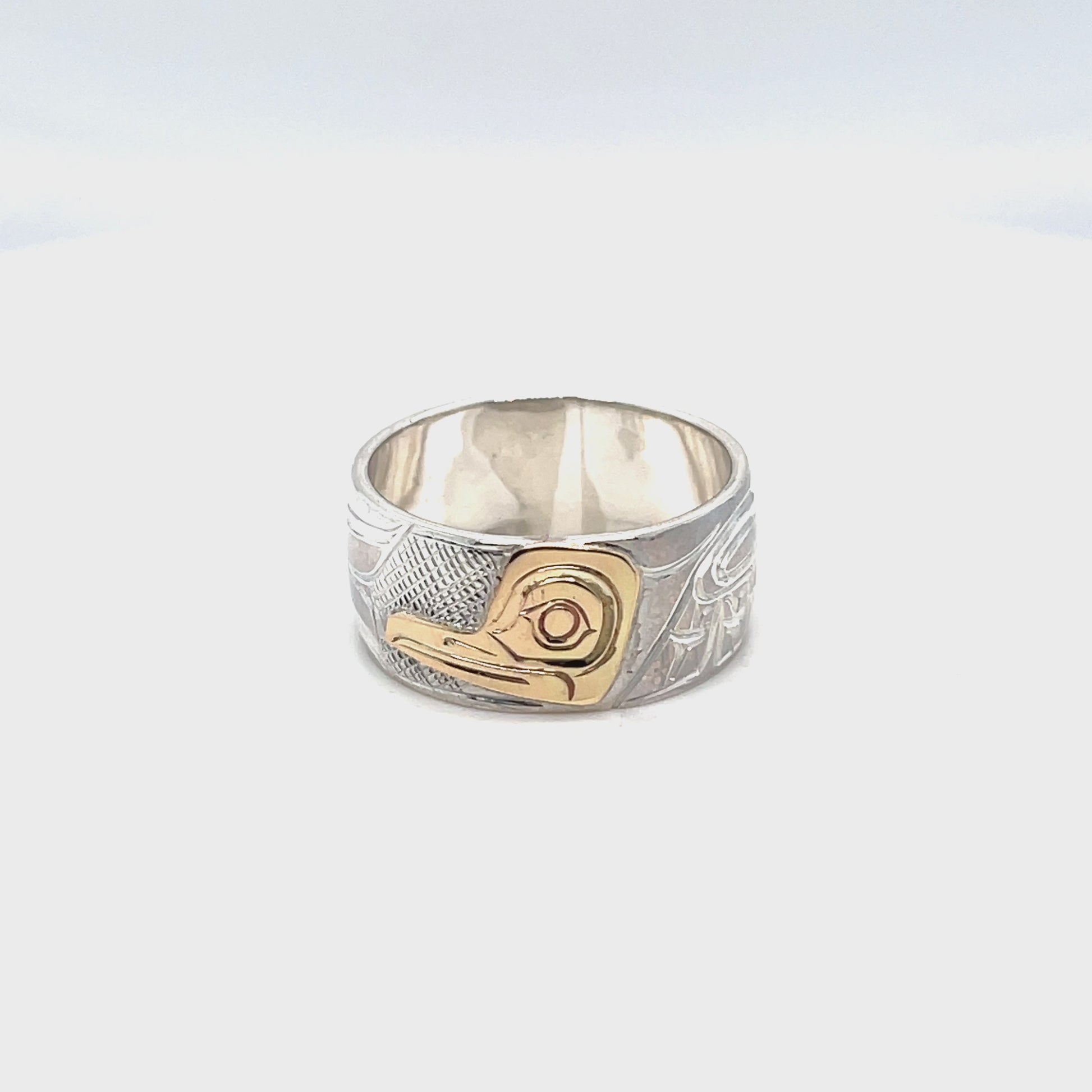 Mike Matilpi, born in Alert Bay to the Kwakwaka’wakw Nation and a family of revered wood and jewellery carvers, has been carving silver and gold jewellery since 1993. He was taught by his father, Charles Harper, himself a well-known carver who has been working since 1974. Mike has also been greatly influenced by other relatives of his, such as Doug Harper, Glen Harper, Les Harper, George Matilpi, Dennis Matilpi, and Paddy Seaweed. He has taken many specialized courses in silversmithing to further his craft, including bezel stone setting. His work can be recognized by the masterful combination of gold and silver and the charming and traditional animal designs.