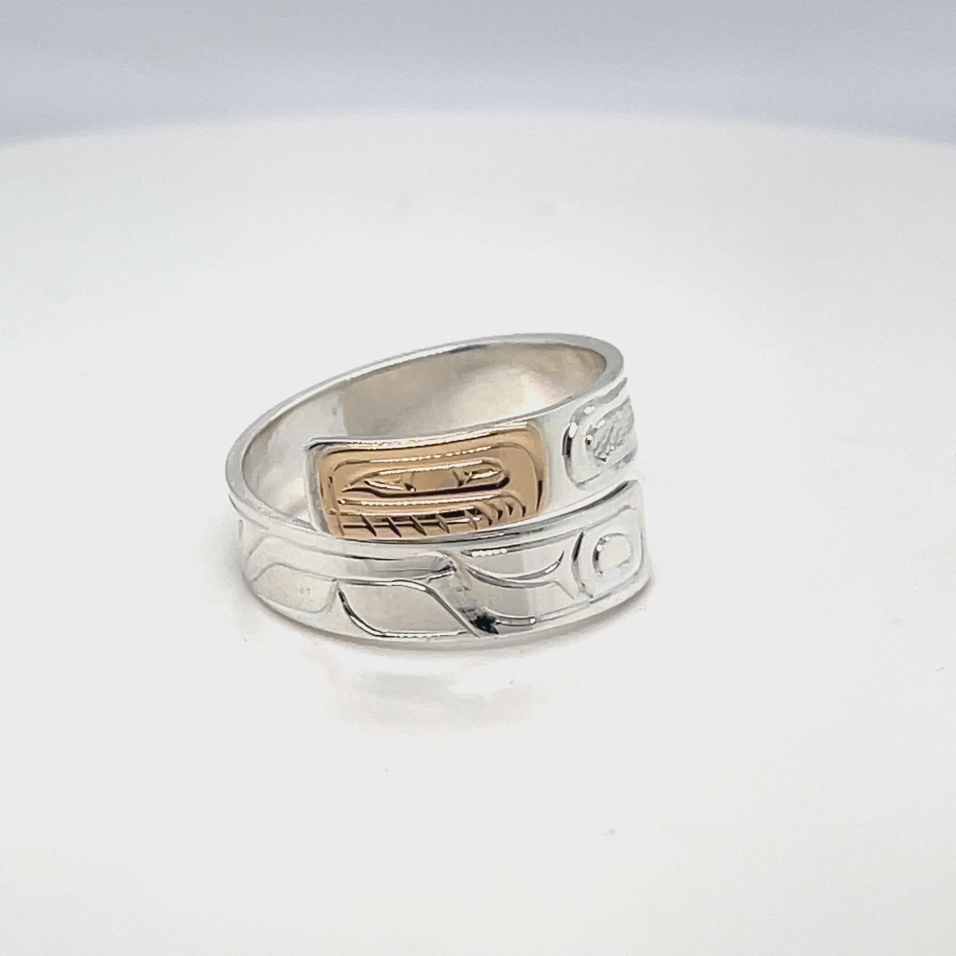 Mike Matilpi, born in Alert Bay to the Kwakwaka’wakw Nation and a family of revered wood and jewellery carvers, has been carving silver and gold jewellery since 1993. He was taught by his father, Charles Harper, himself a well-known carver who has been working since 1974. Mike has also been greatly influenced by other relatives of his, such as Doug Harper, Glen Harper, Les Harper, George Matilpi, Dennis Matilpi, and Paddy Seaweed. He has taken many specialized courses in silversmithing to further his craft, including bezel stone setting. His work can be recognized by the masterful combination of gold and silver and the charming and traditional animal designs.
