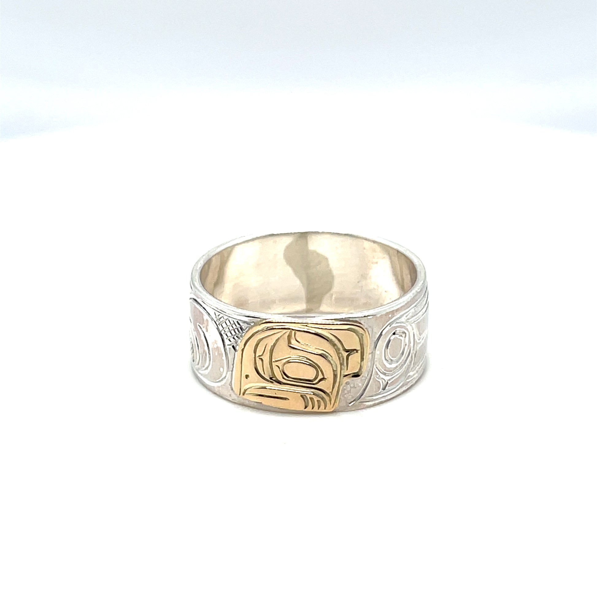 Mike Matilpi, born in Alert Bay to the Kwakwaka’wakw Nation and a family of revered wood and jewellery carvers, has been carving silver and gold jewellery since 1993. He was taught by his father, Charles Harper, himself a well-known carver who has been working since 1974. Mike has also been greatly influenced by other relatives of his, such as Doug Harper, Glen Harper, Les Harper, George Matilpi, Dennis Matilpi, and Paddy Seaweed. He has taken many specialized courses in silversmithing to further his craft, including bezel stone setting. His work can be recognized by the masterful combination of gold and silver and the charming and traditional animal designs.