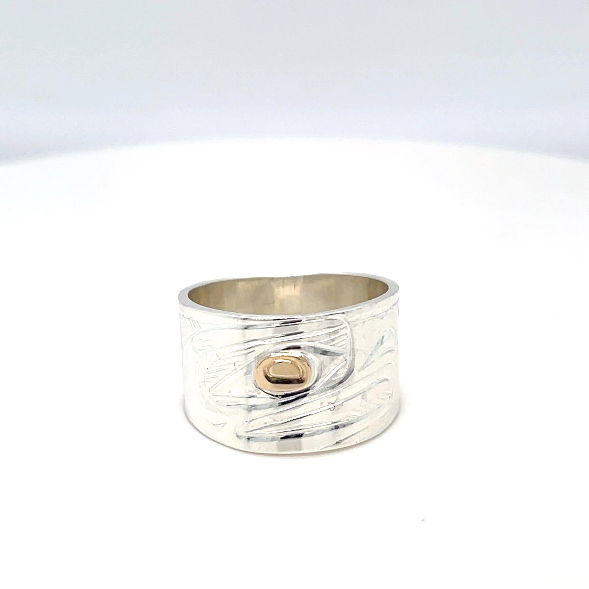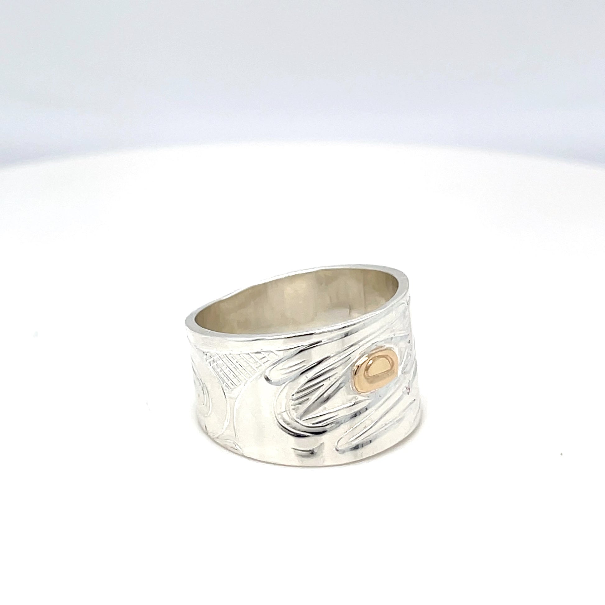 Corrine Hunt is a Vancouver-based contemporary First Nations artist born in Alert Bay in 1959 to the well-known Raven Gwa’waina clan, of Tlingit and Kwakwaka’wakw heritage. Her paternal grandmother, a Tlingit noblewoman from Alaska, gave her the name Nugwam Gelatleg’lees, meaning “killer whale scratching her back on the beach.” Her first major influence and teacher was her uncle Norman Brotchie; today, she is a mentor and teacher to many other artists, including Hollie Bartlett, and has been working as a jeweller reflecting the themes and traditions of her heritage since 1985. Notably, she designed the logo for the World Peace Forum, held in Vancouver in 2006, and co-created the Vancouver 2010 Olympic medals with Omer Arbel. Corrine is celebrated for her contemporary yet ageless designs, which are often abstract and subtle in their depiction of images.