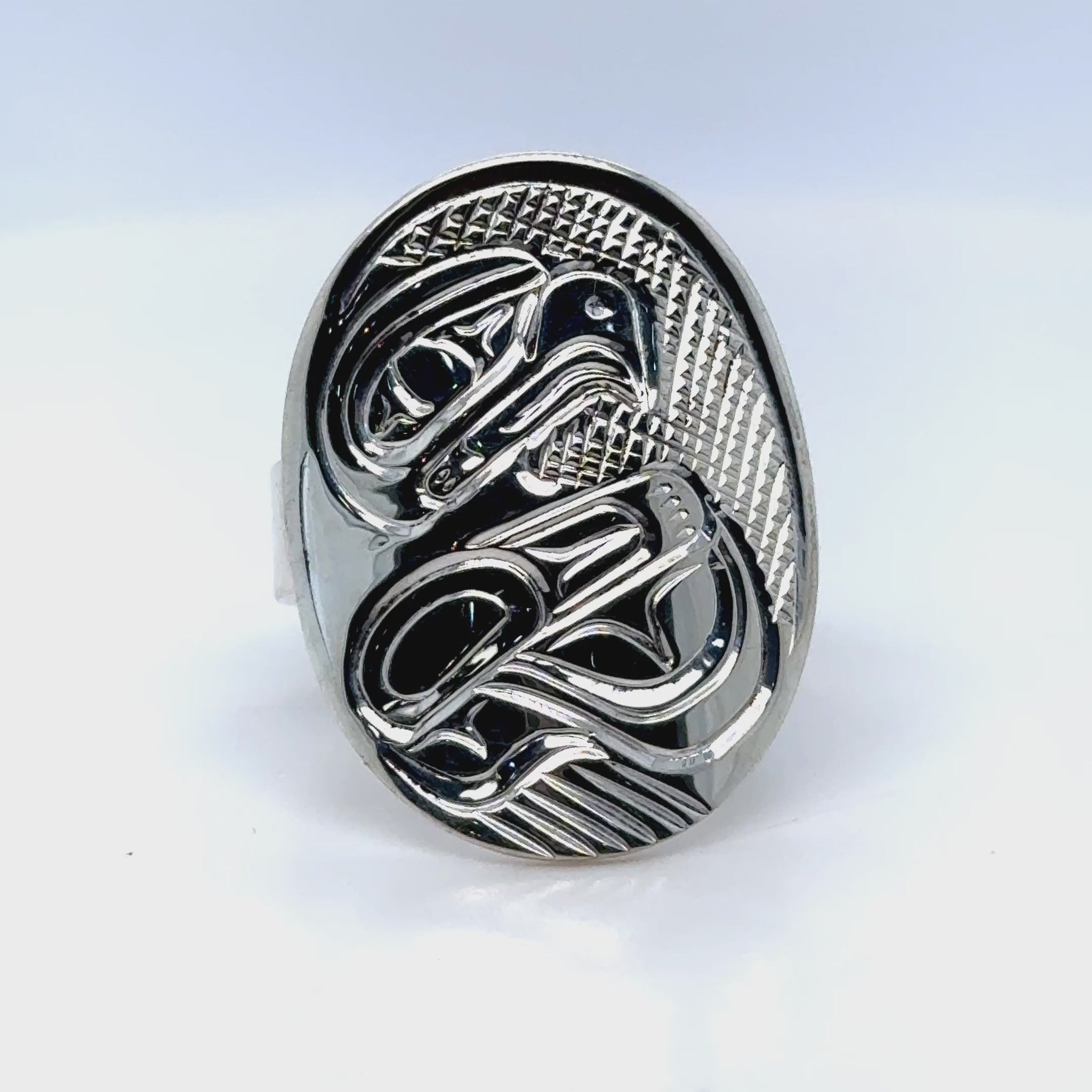 Mike Matilpi, born in Alert Bay to the Kwakwaka’wakw Nation and a family of revered wood and jewellery carvers, has been carving silver and gold jewellery since 1993. He was taught by his father, Charles Harper, himself a well-known carver who has been working since 1974. Mike has also been greatly influenced by other relatives of his, such as Doug Harper, Glen Harper, Les Harper, George Matilpi, Dennis Matilpi, and Paddy Seaweed. He has taken many specialized courses in silversmithing to further his craft, including bezel stone setting. His work can be recognized by the masterful combination of gold and silver and the charming and traditional animal designs.