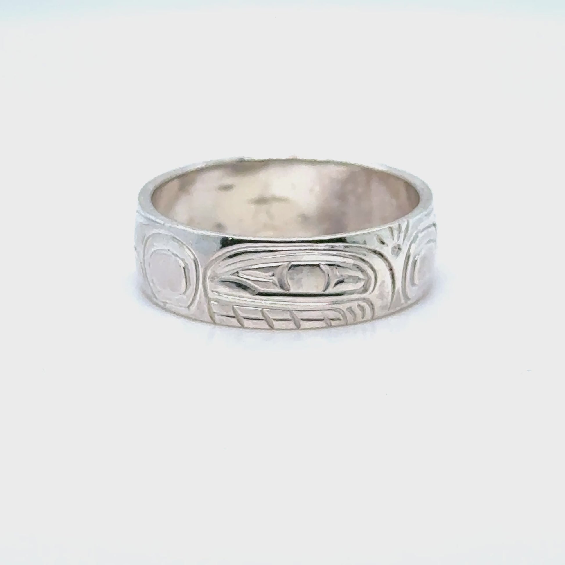 Mike Matilpi, born in Alert Bay to the Kwakwaka’wakw Nation and a family of revered wood and jewellery carvers, has been carving silver and gold jewellery since 1993. He was taught by his father, Charles Harper, himself a well-known carver who has been working since 1974. Mike has also been greatly influenced by other relatives of his, such as Doug Harper, Glen Harper, Les Harper, George Matilpi, Dennis Matilpi, and Paddy Seaweed. He has taken many specialized courses in silversmithing to further his craft, including bezel stone setting. His work can be recognized by the masterful combination of gold and silver and the charming and traditional animal designs.