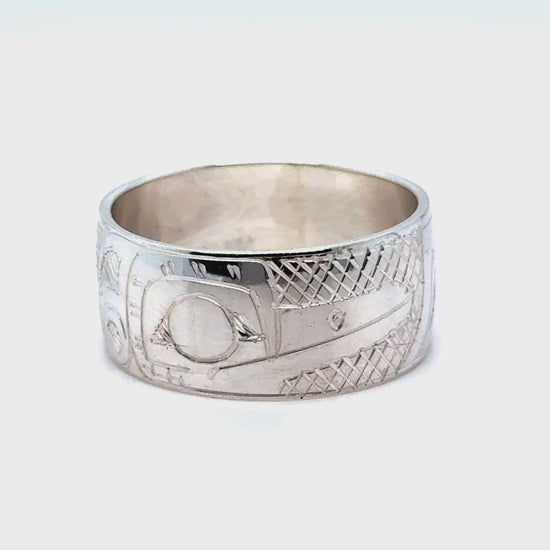 Gilbert Pat, born in Sardis, British Columbia in 1945, is a well-known Northwest Coast jewelry artist of the Coast Salish Nation. After moving to Alert Bay and working as a carpenter and commercial fisherman, he began carving in 1976. He is mainly self-taught, but was mentored by Lloyd Wadhams Sr. of the celebrated Seaweed and Shaughnessy families, from whom he learned to carve with fine detail and high craftsmanship. He works primarily in silver, and his work is widely recognized for its whimsical carvings that incorporate traditional Salish design elements.