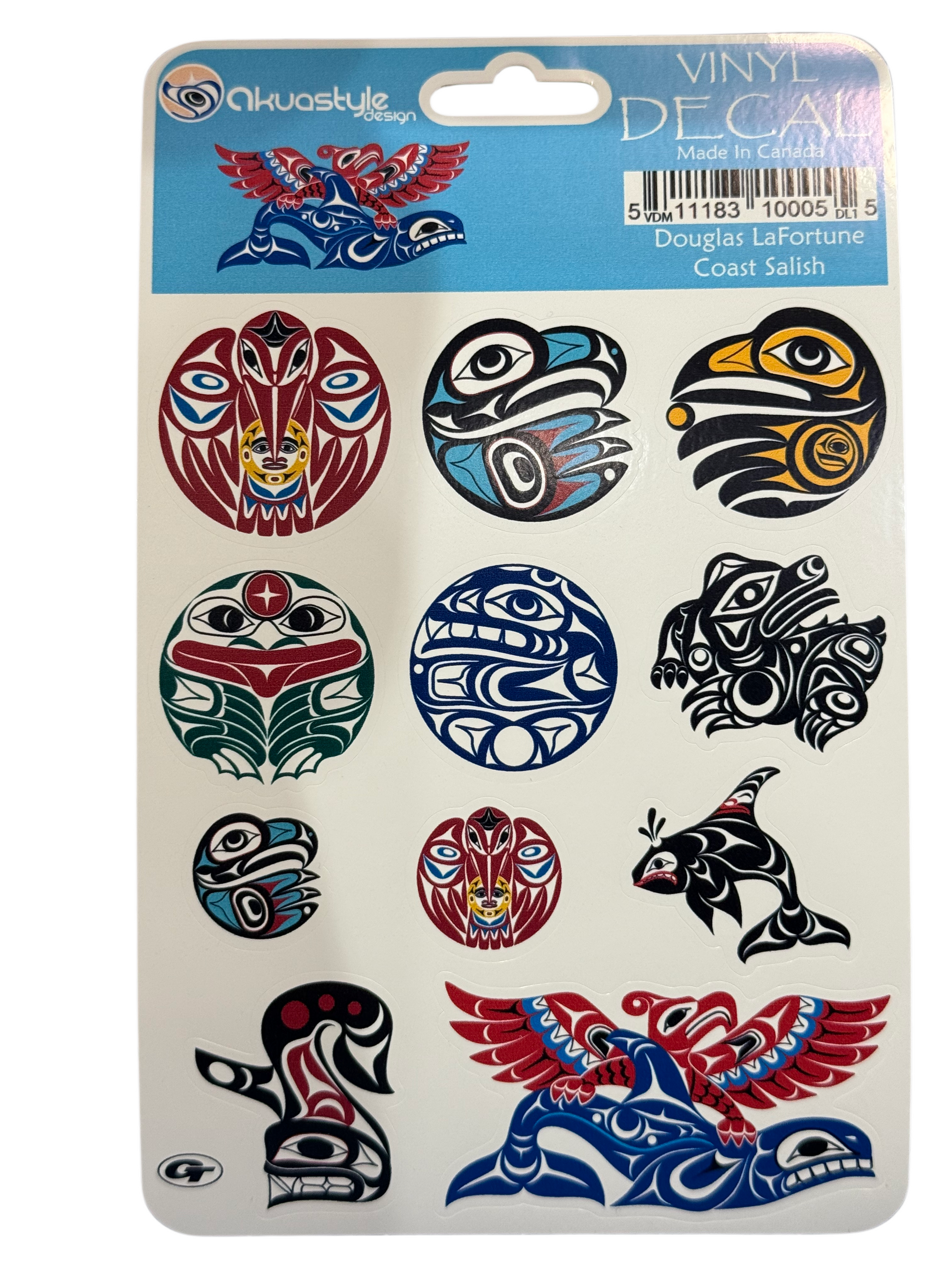 Sheet of multiple vinyl stickers. Features a peel-away backing and art by Coast Salish artist, Doug LaFortune.