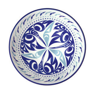 Porcelain bowl with a 6" diameter, featuring a textured exterior and contemporary Indigenous designed interior.