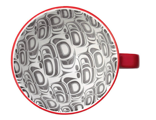 Porcelain mug with a 12 oz./355ml capacity, featuring a textured exterior and contemporary Indigenous designed interior.