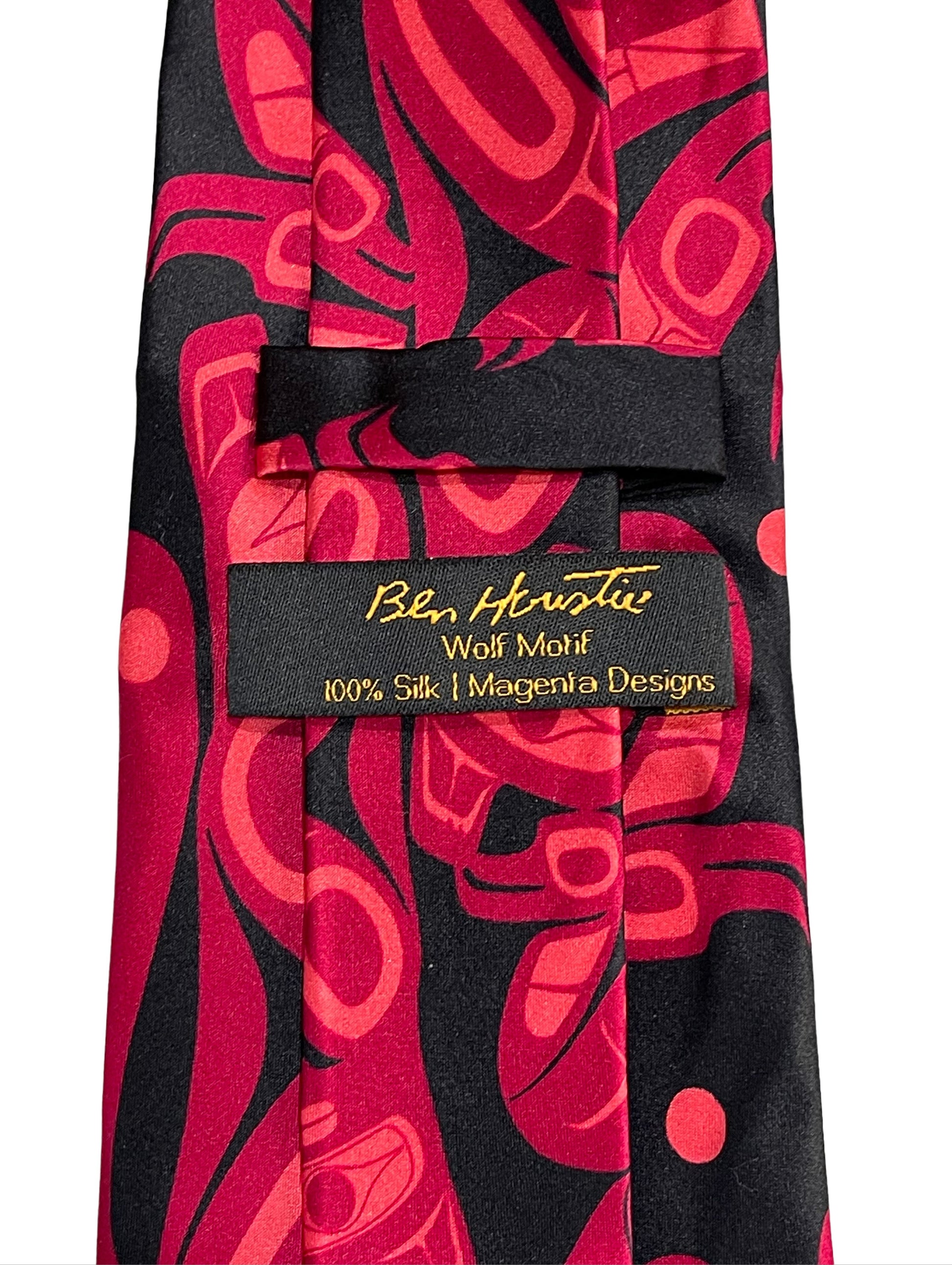 100% silk tie with hummingbird pattern, designed by Indigenous artist Ben Houstie.