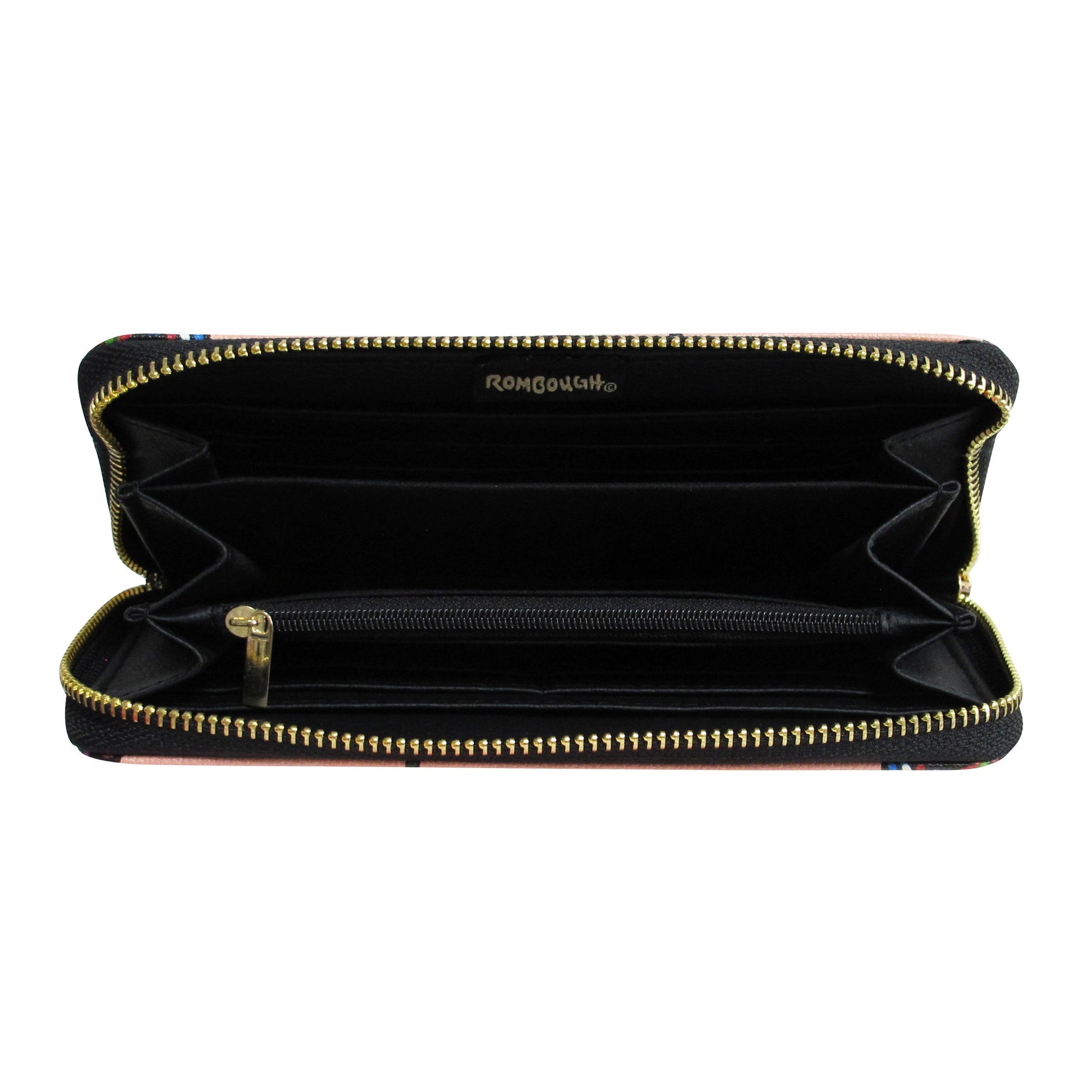 Wallets are 12.5cm x 21cm; it is zipper-closed, with 8 card slots, 5 compartments, and 1 zipped pocket inside.