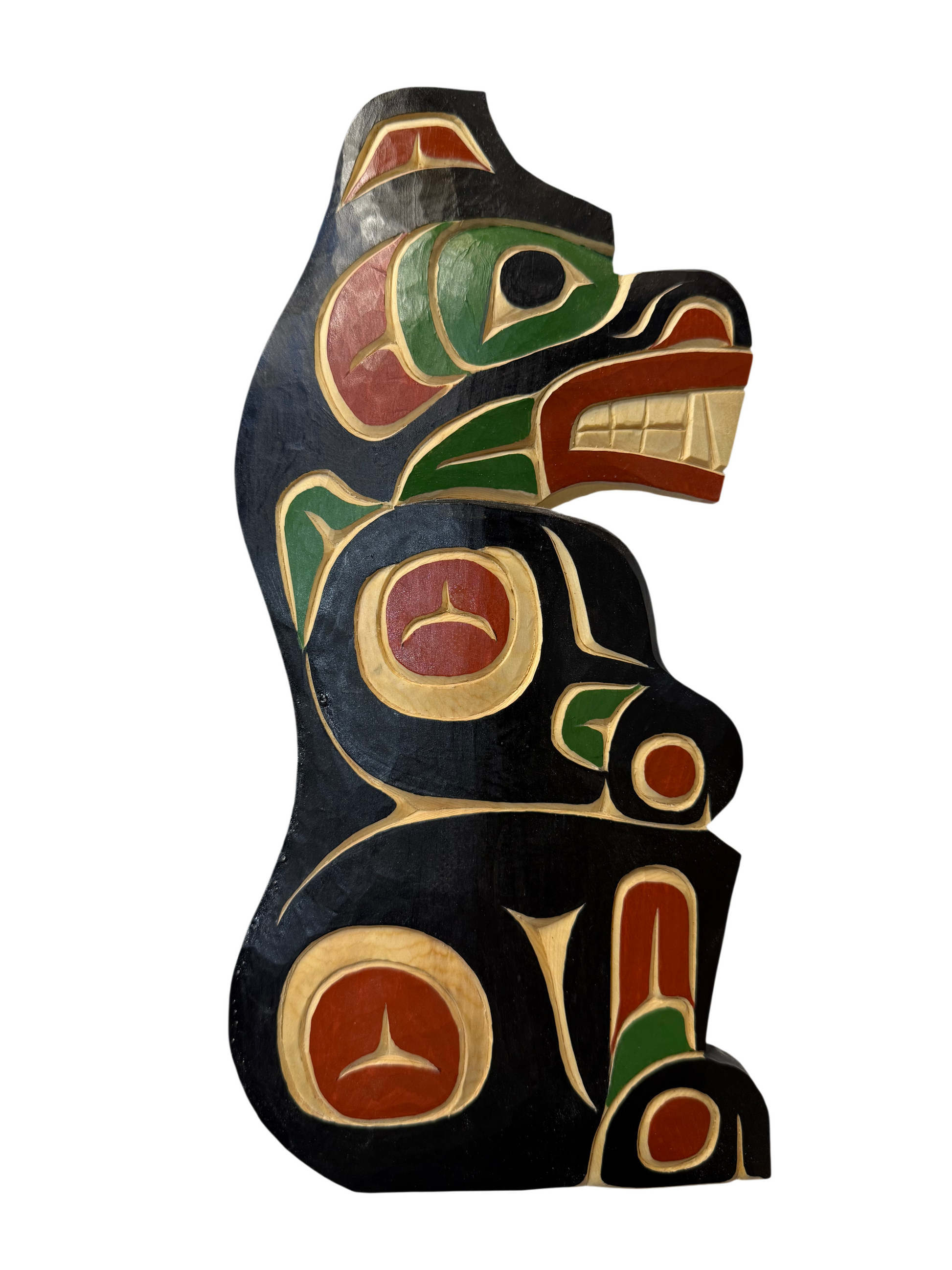 Hand-carved yellow cedar plaque by 'Namgis First Nation artist Tom Whonnock of Alert Bay, BC. This piece features a Bear, symbolizing protection, strength, nurturing, power, and healing.