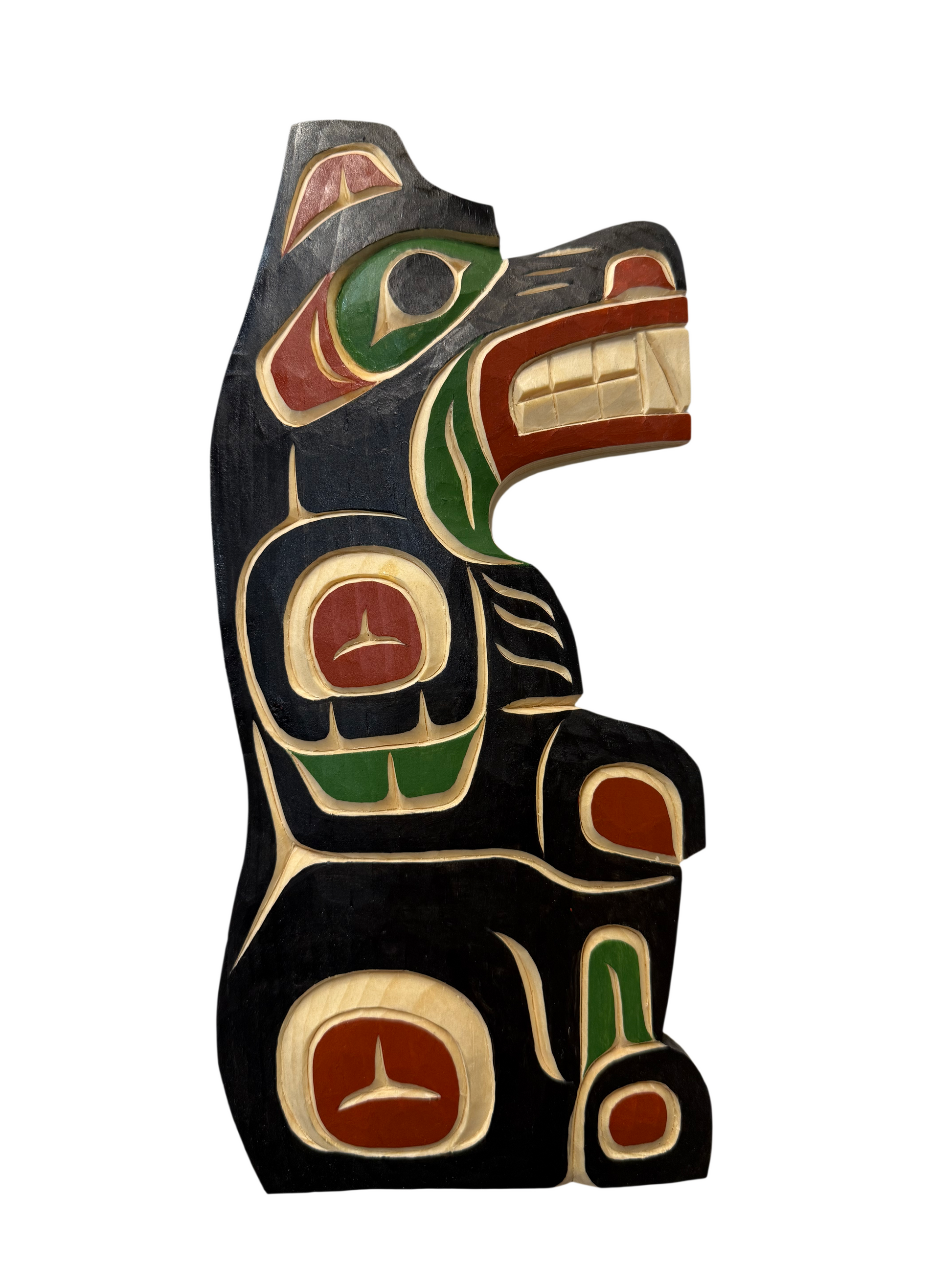 Hand-carved pine plaque by ’Namgis First Nation artist Tom Whonnock of Alert Bay, BC. This lively piece highlights the otter’s playful spirit and graceful movement, beautifully captured through Tom’s skilled carving.