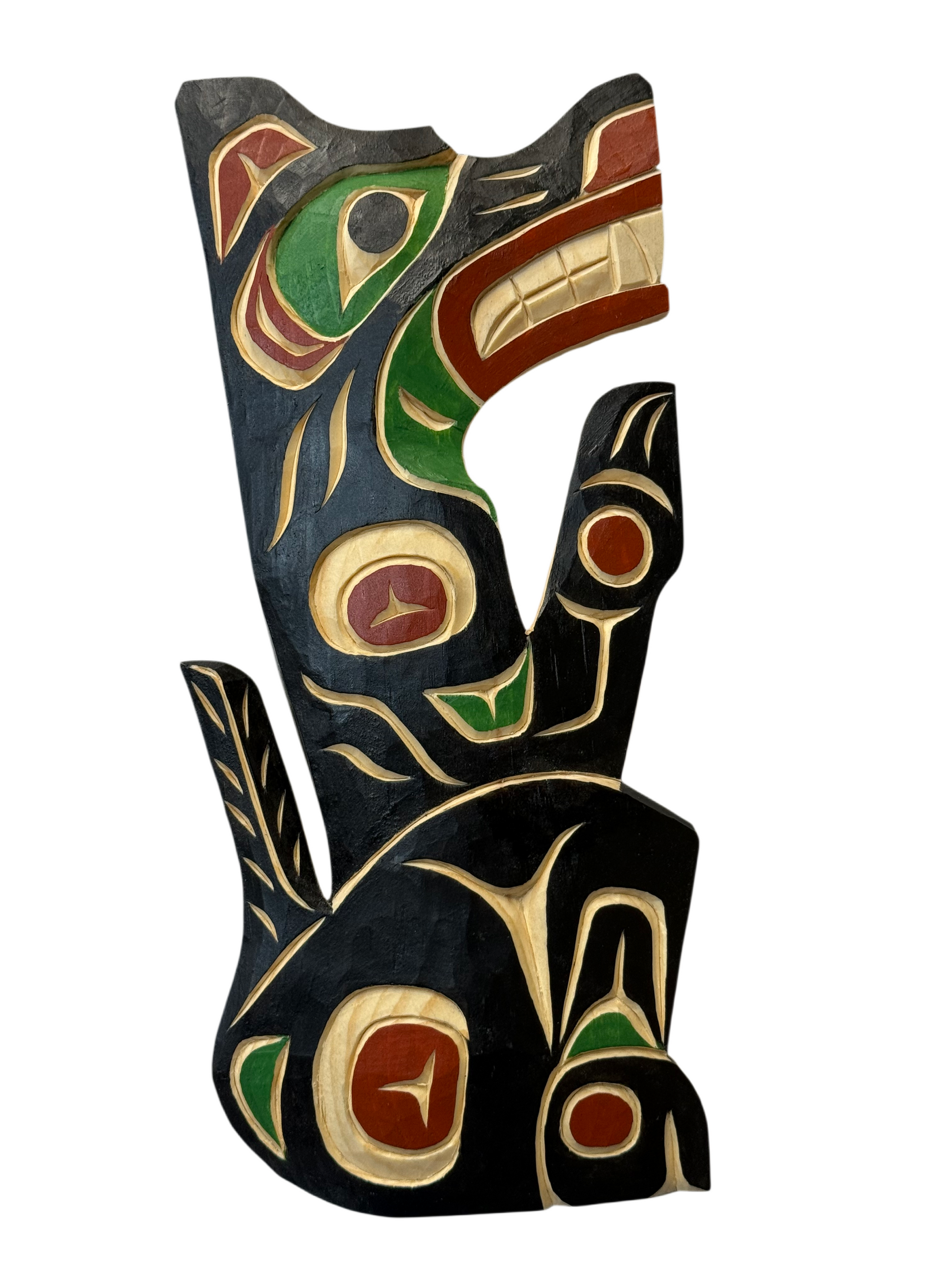 Hand-carved pine plaque by ’Namgis First Nation artist Tom Whonnock of Alert Bay, BC. This lively piece highlights the otter’s playful spirit and graceful movement, beautifully captured through Tom’s skilled carving.