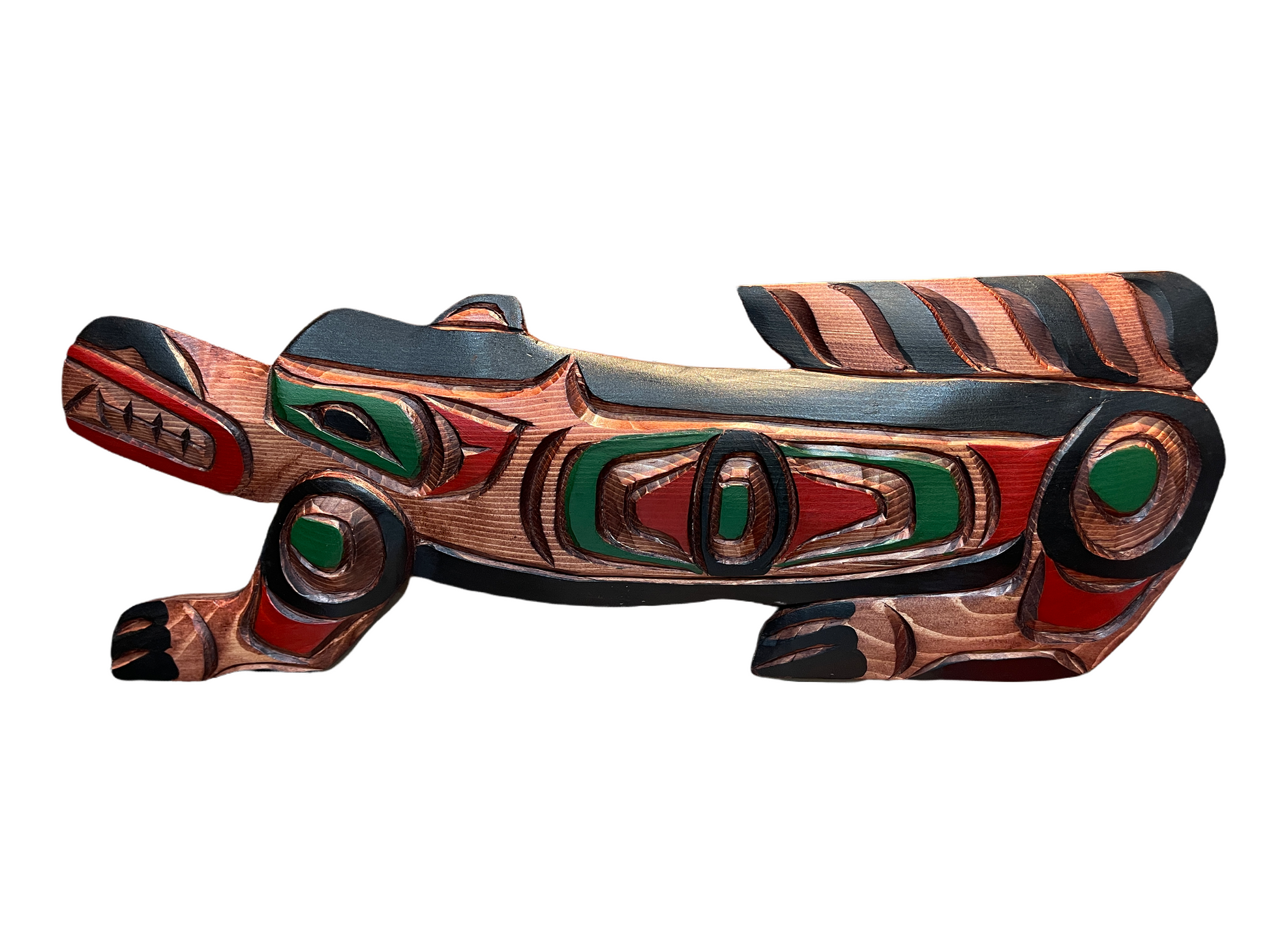 George Matilpi was born in Alert Bay, BC and is a member of the Kwakwaka'wakw and Dakelh Nations. He was born in 1953 and has been carving for over 50 years. Taught by Amos Dawson, Chief of the Carrier (Dakelh) Nation, George Matilpi carves exceptional and traditional Kawkiult wood plaques. He employs the traditional black, red, and turquoise colour scheme on unstained cedar wood. Within this framework, Matilpi creates innovative and charismatic animal plaques with personality.